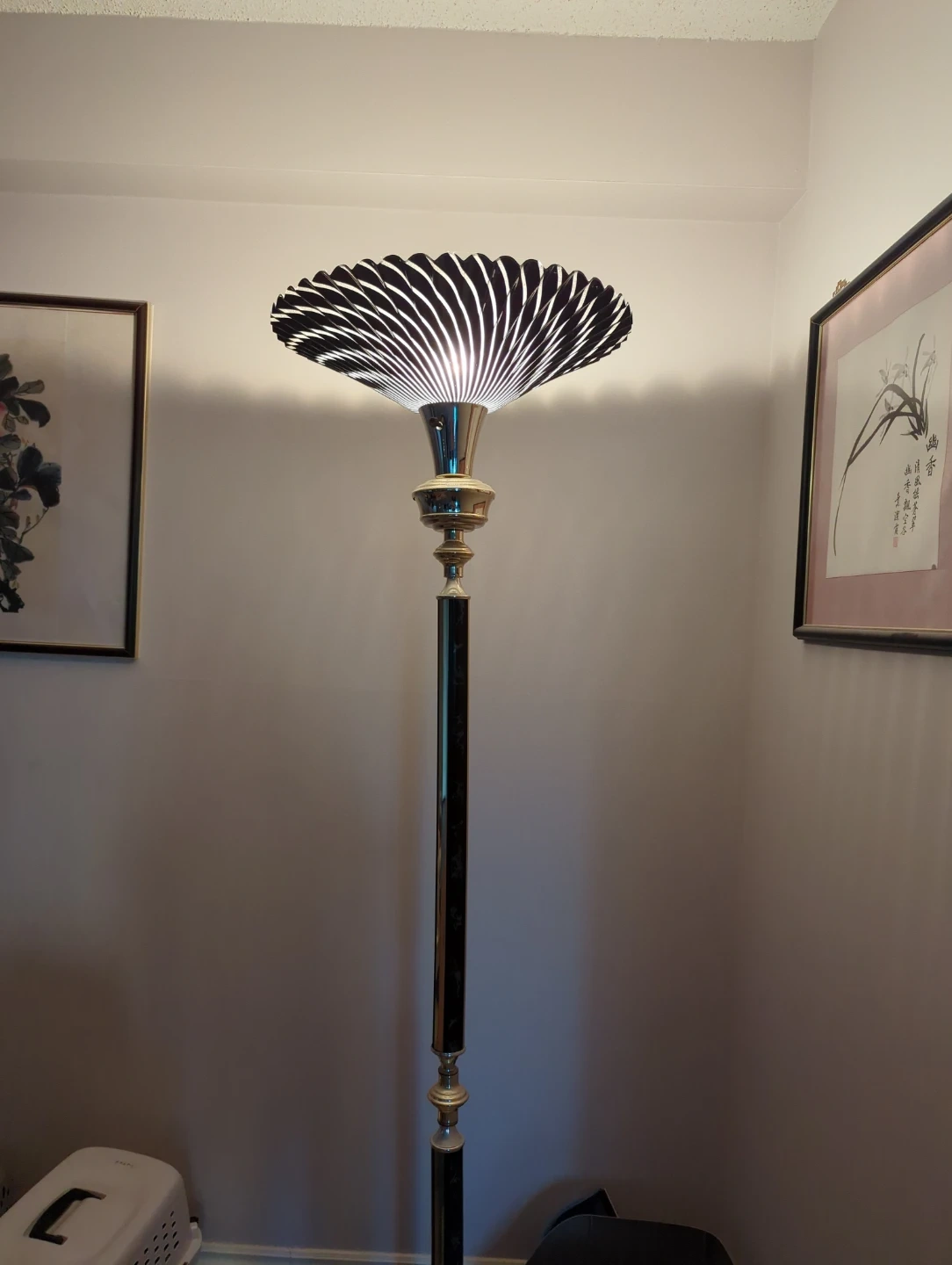 A 6ft tall floor lamp with a distinctive black and white striped shade that creates a beautiful light pattern. It features a metallic pole with decorative accents. This lamp is perfect for adding ambient lighting to any room.