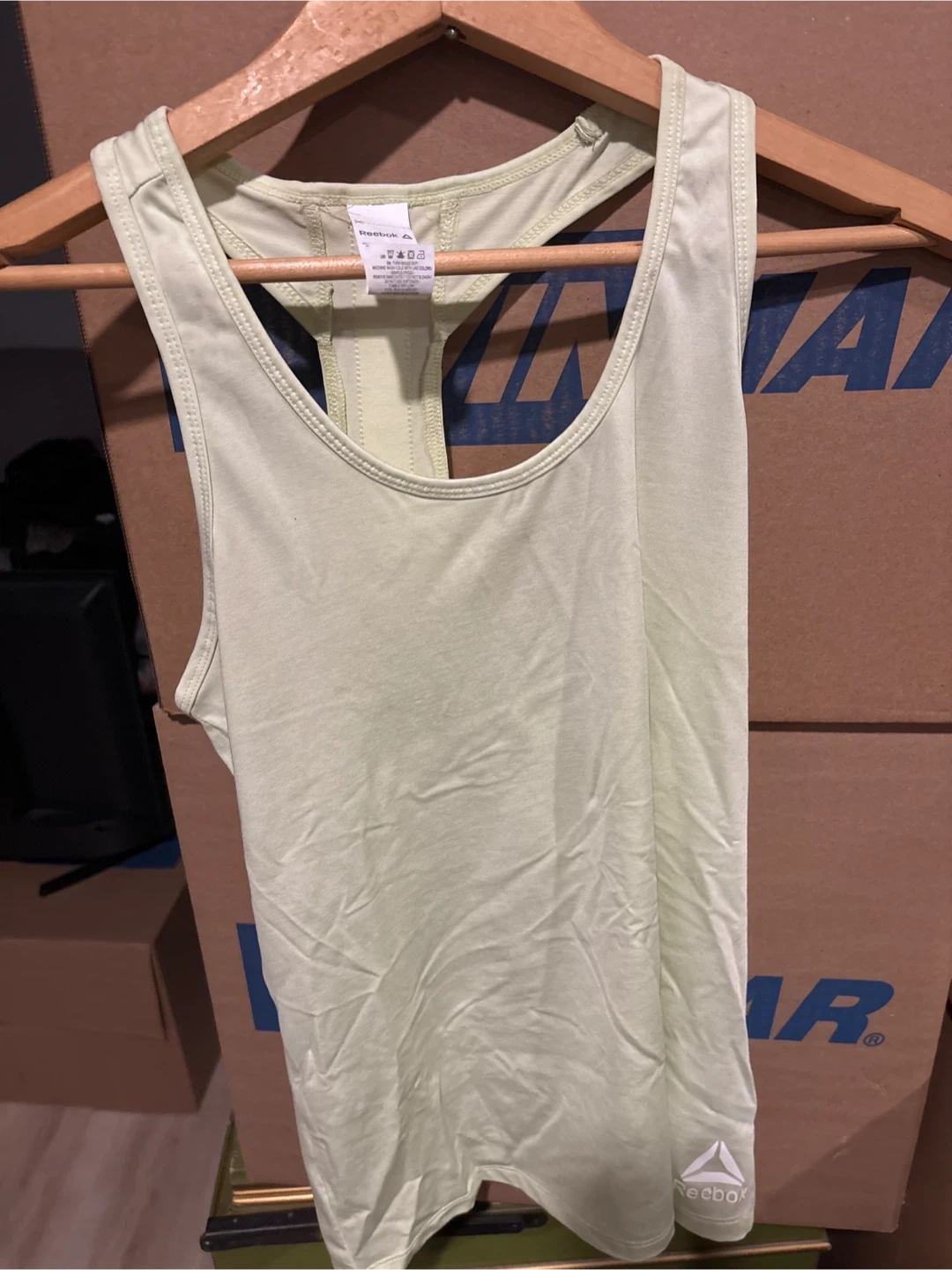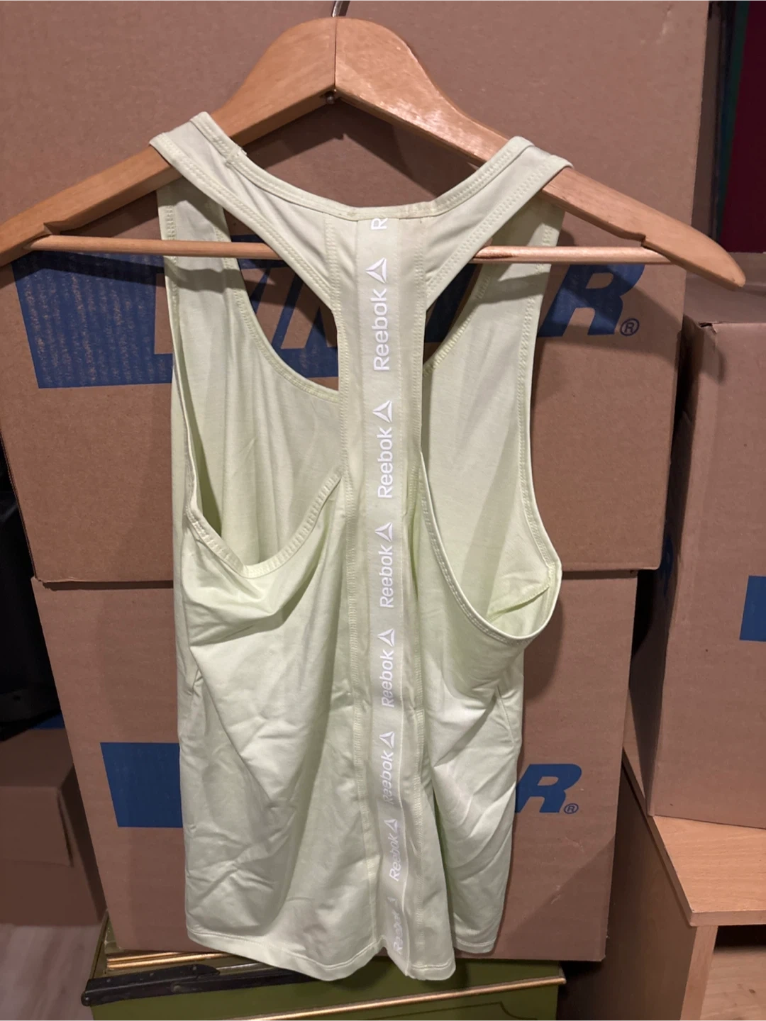Light green athletic tank top from Reebok. Features a racerback design with repeating Reebok logo detail on the straps. Breathable fabric for active wear.