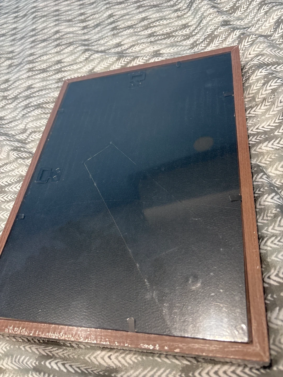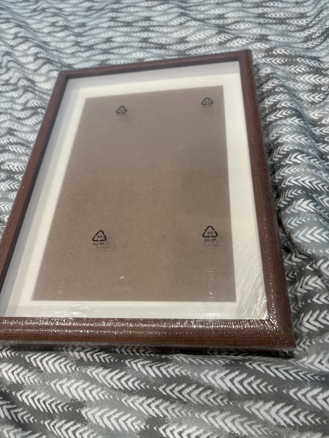 A classic brown wood picture frame. It's ready to display your favourite photos or artwork. The frame includes a white mat. It's perfect for showcasing memories!