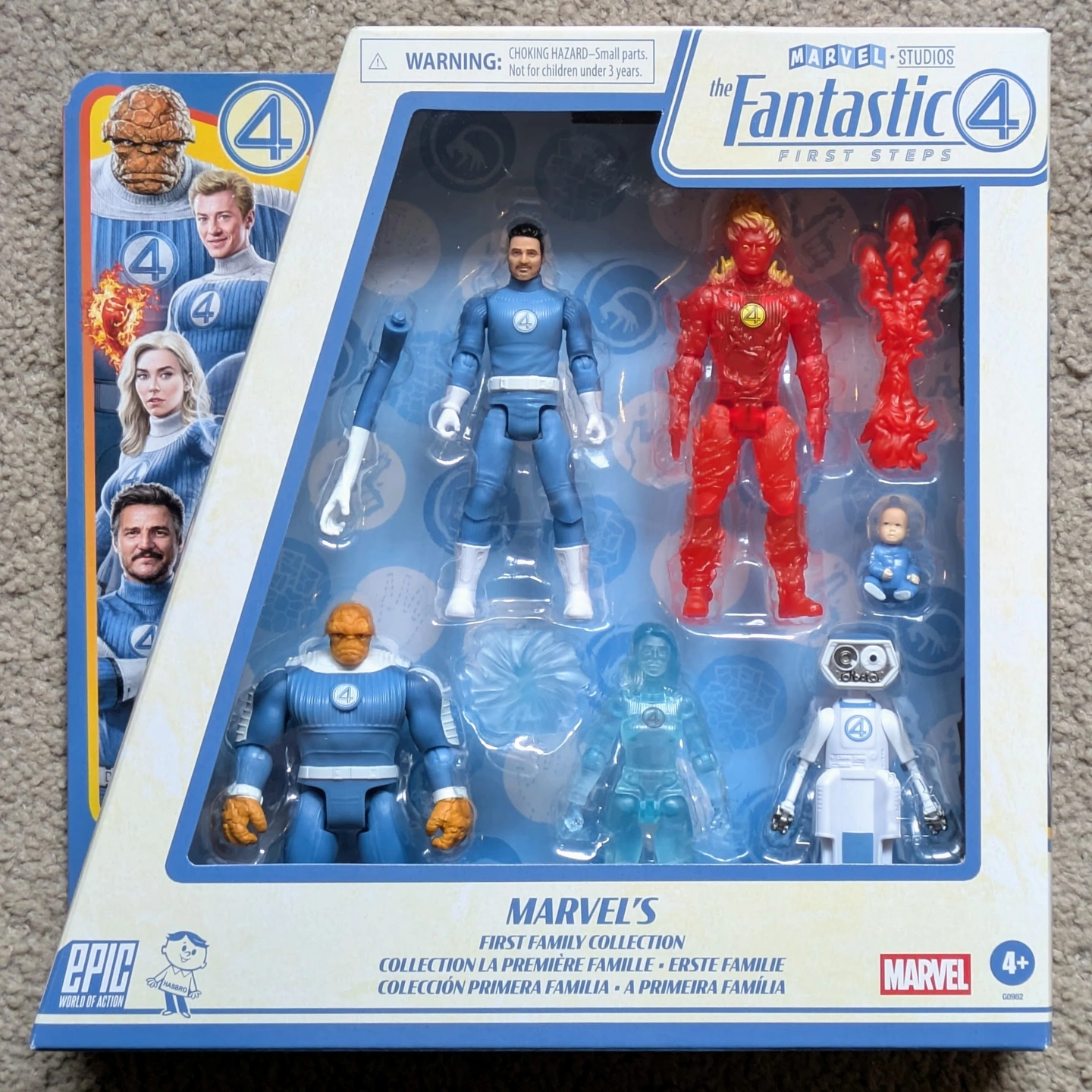 Brand new, factory sealed The Fantastic 4 First Steps Marvel's First Family Collection. Includes 4-inch scale figures of Mister Fantastic, Invisible Woman, Human Torch, The Thing, Franklin and H.E.R.B.I.E.