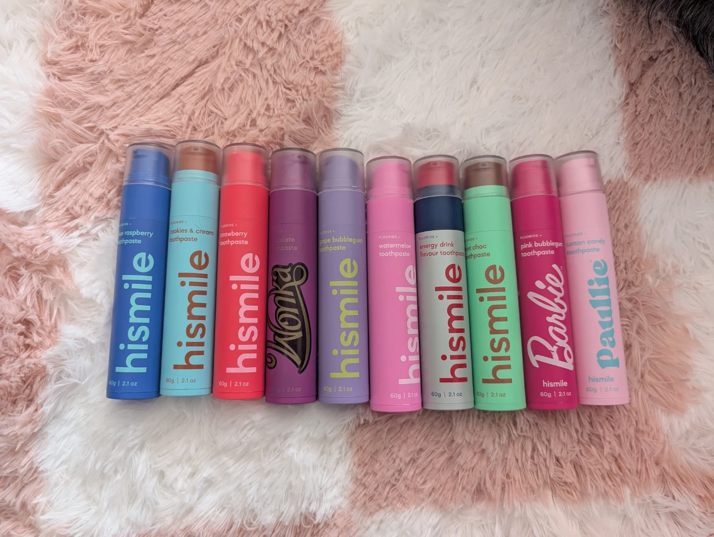 A collection of Hismile toothpastes in various fun flavours. Each tube is 60g or 2.1 oz. Flavours include raspberry, cookies & cream, strawberry, chocolate, grape bubblegum, watermelon, energy drink, pink bubblegum, and cotton candy.