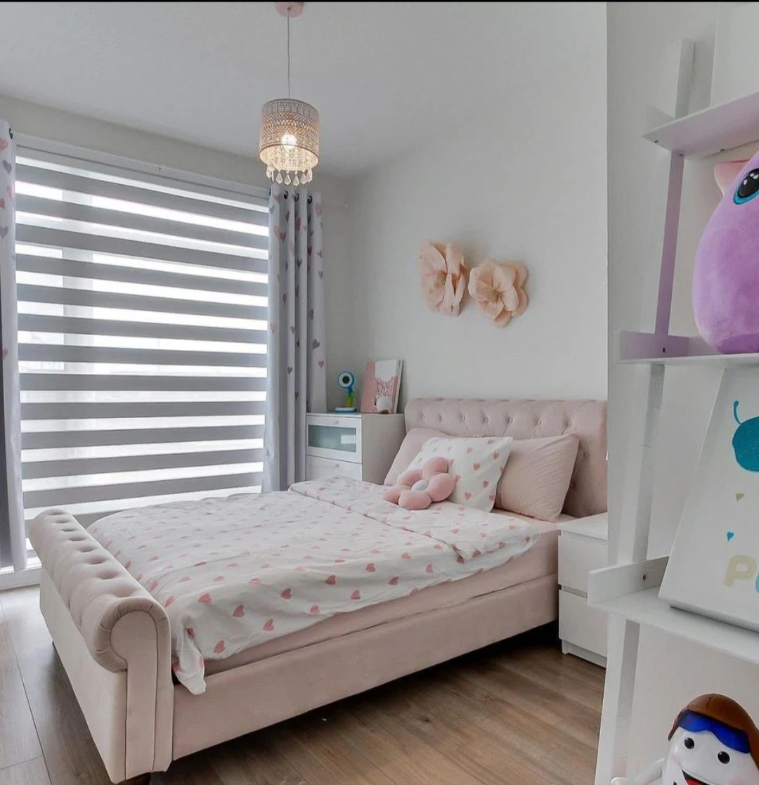 A lovely pink sleigh bed frame that's tufted and comes with a matching mattress. It's upholstered in a soft fabric. This bed would be super cozy for a child's bedroom! Size - Double. Mattress included !!!