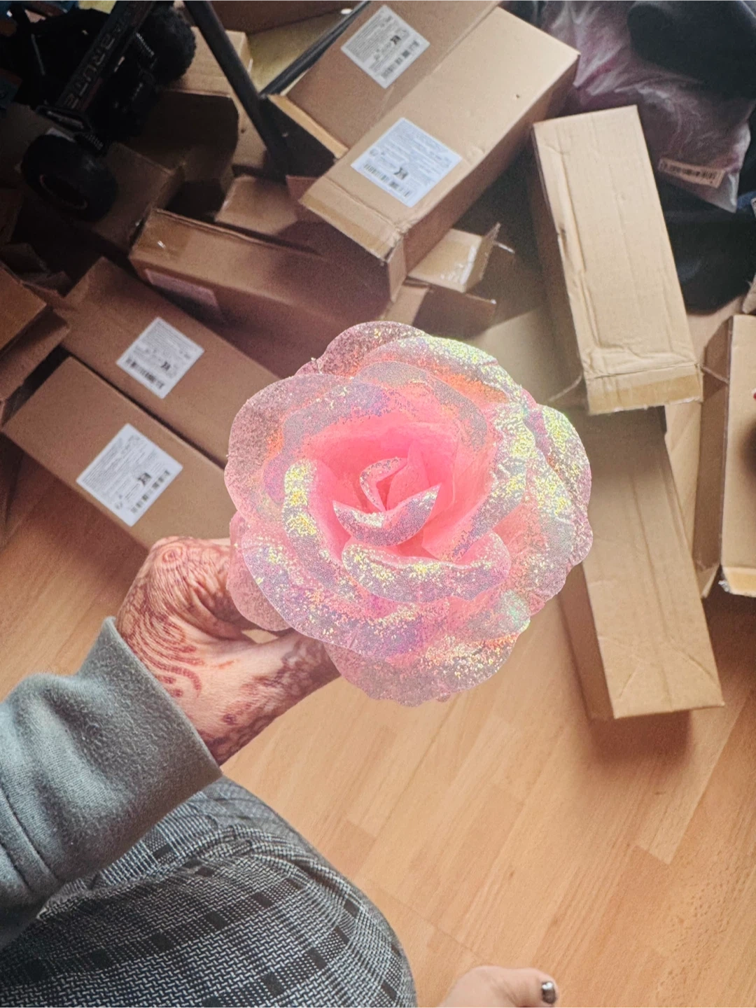 A beautiful golden rose, accented with glitter and presented with a golden "Love" stand. It comes in a decorative gift box, ready for that special someone. This rose is a unique decorative piece or a thoughtful gift.
