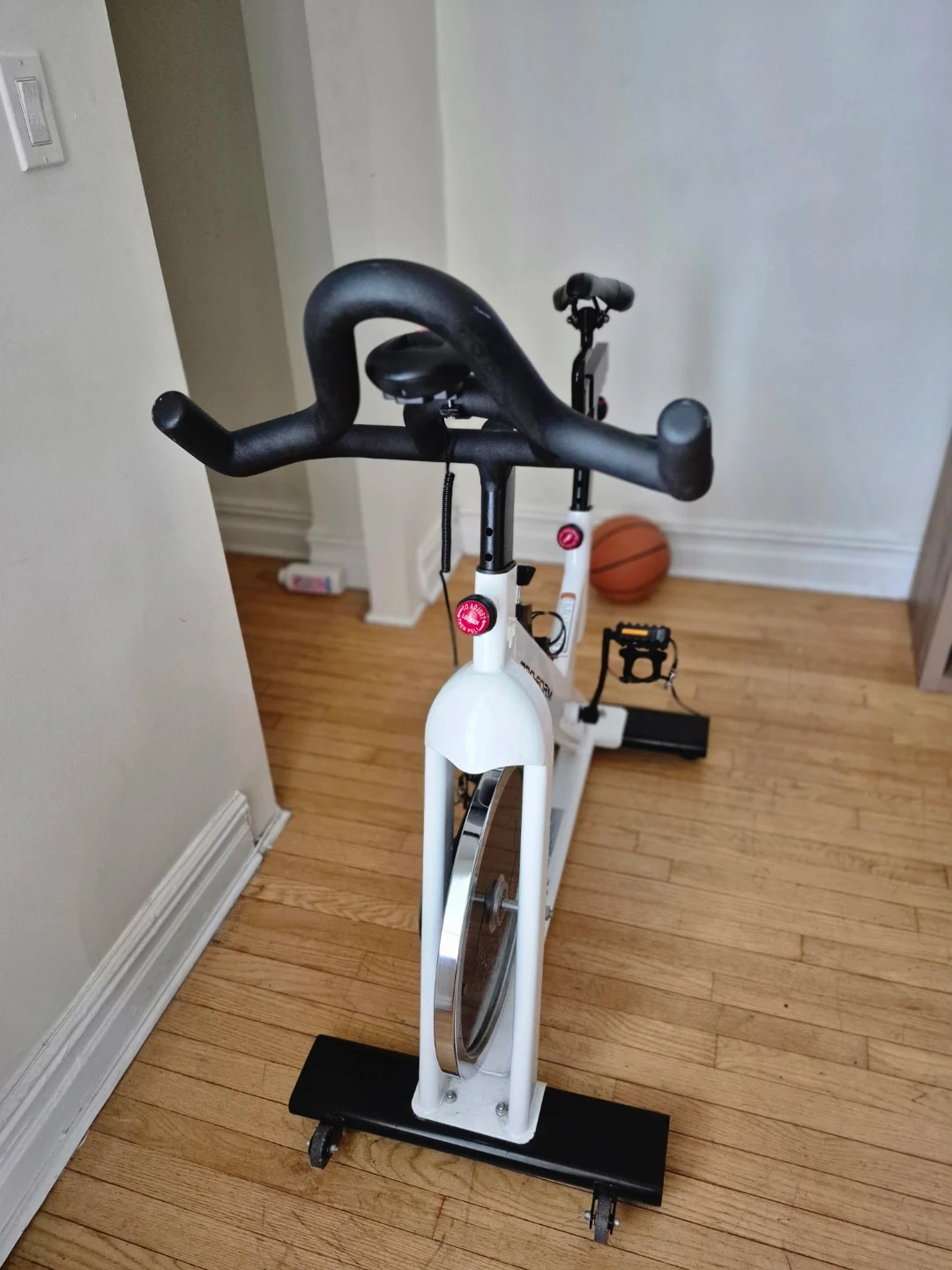 This white ProForm 405 SPX spin bike is ready for your workouts. It's a sturdy piece of exercise equipment for home use. The bike has adjustable seat and handlebars. Its compact design fits well in most spaces. ππ»