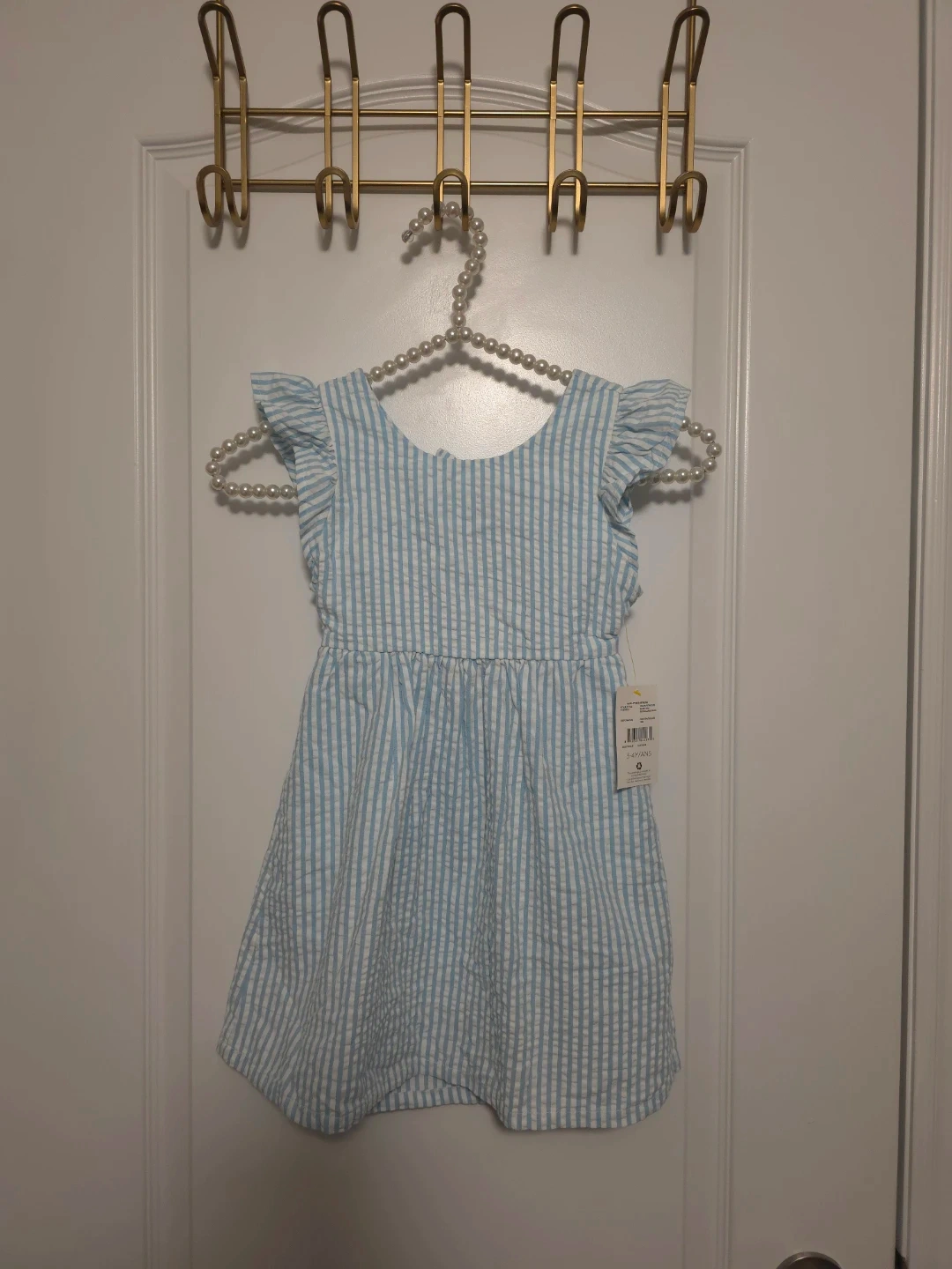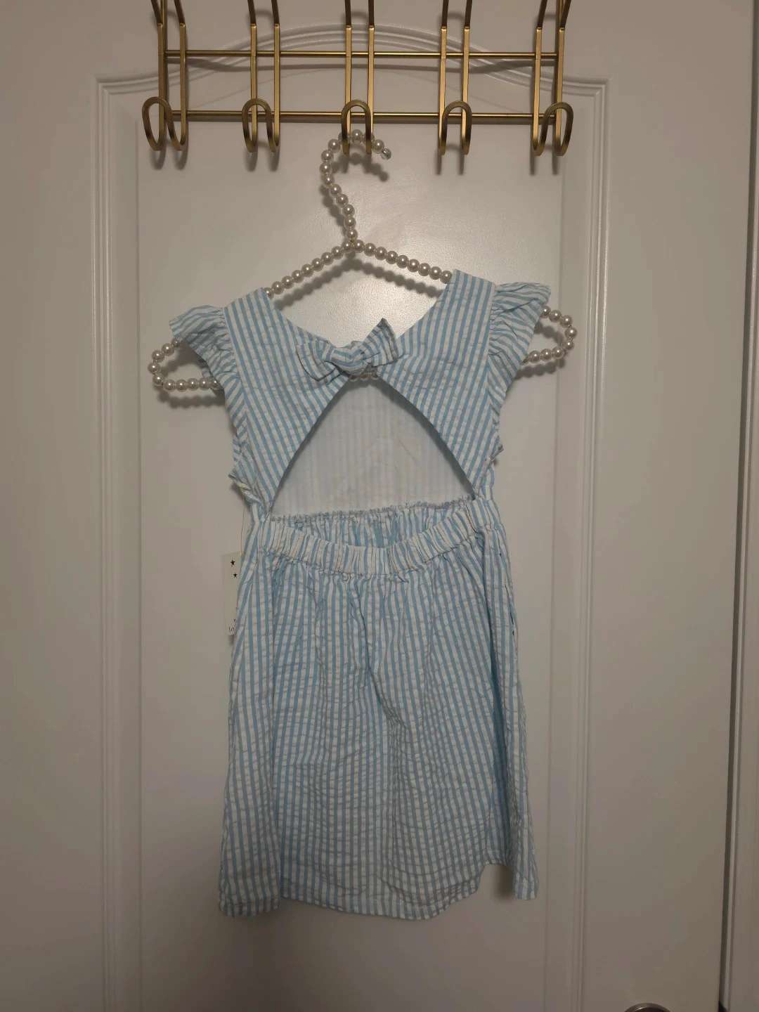 This adorable baby girl's dress features a classic blue and white seersucker stripe pattern. It has flutter sleeves and a cute cutout back with a bow. Perfect for warm weather play!