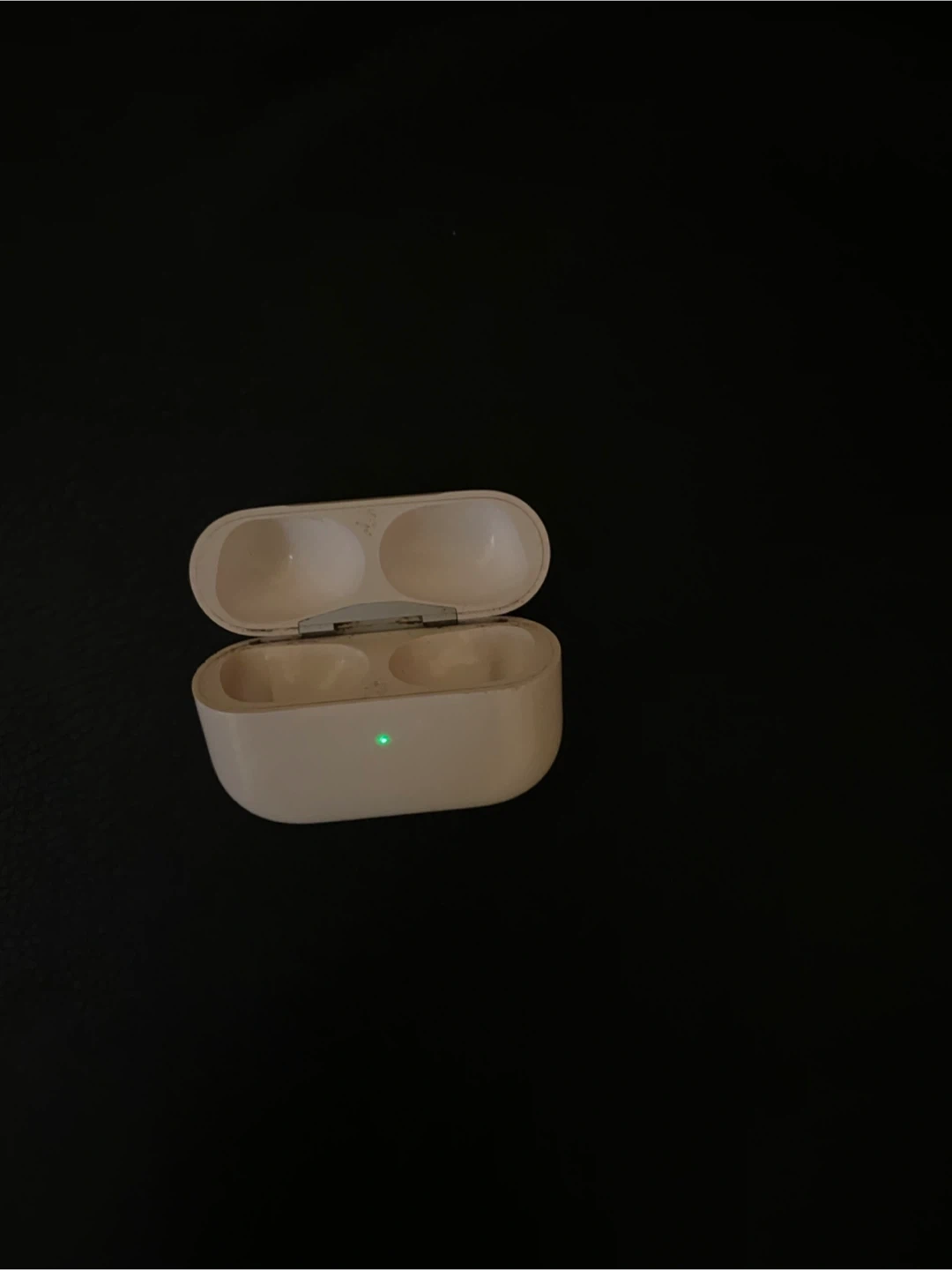 This is a replacement charging case for Apple AirPods Pro. It's white and charges via USB-C or MagSafe. A green indicator light shows it's charging or fully charged. DOES NOT COME WITH AIRPODS. CASE ONLY.