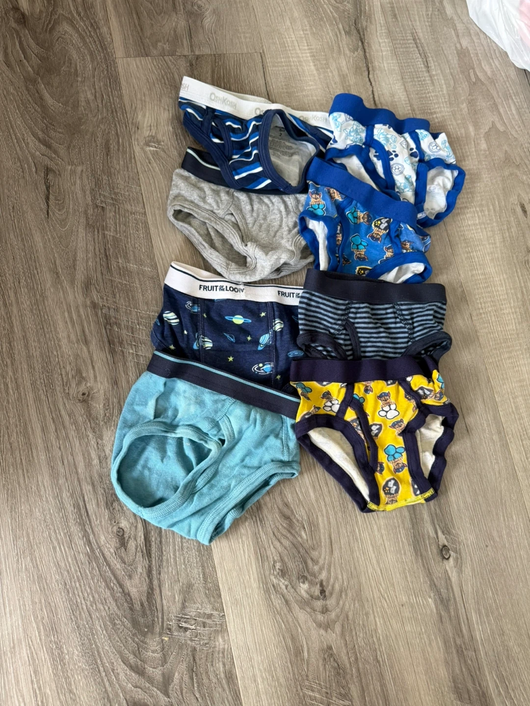 7 pairs of boys' briefs in various sizes and designs.