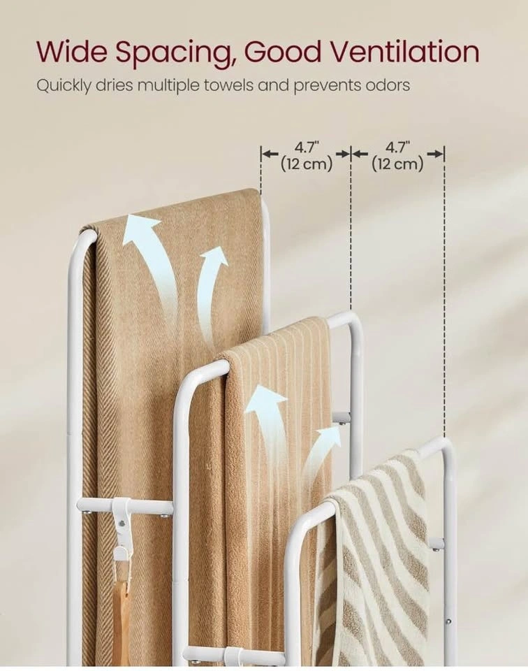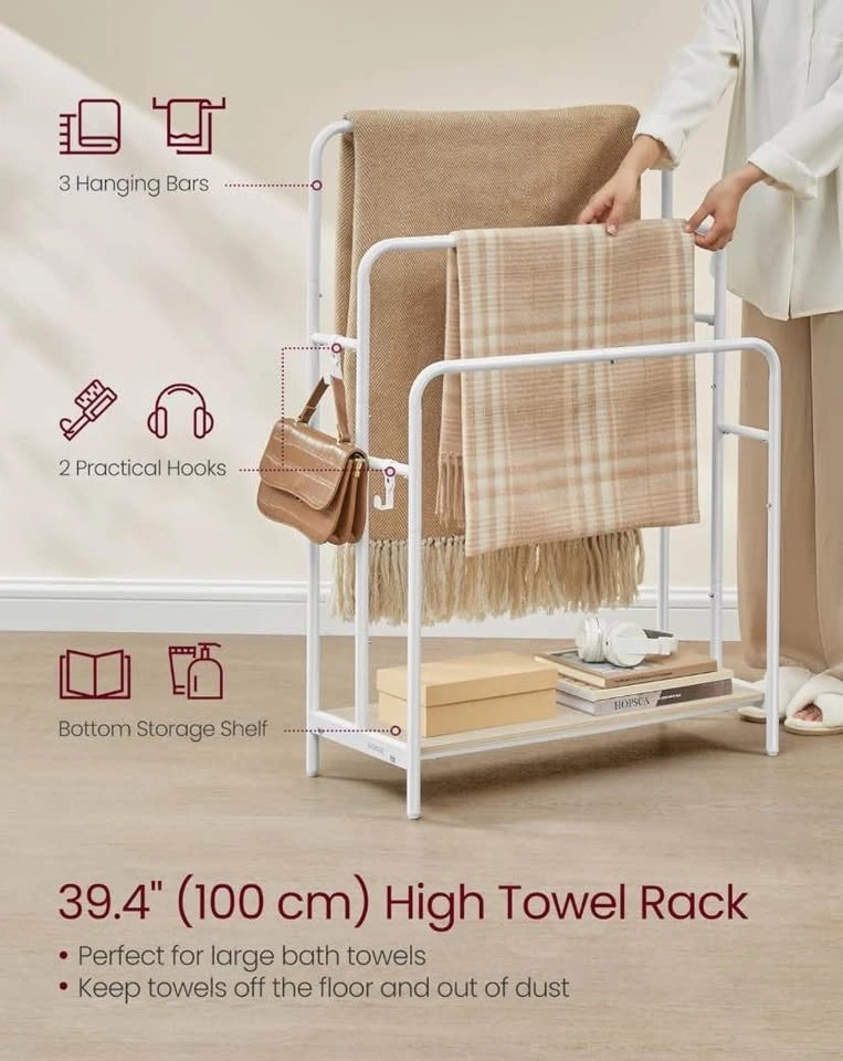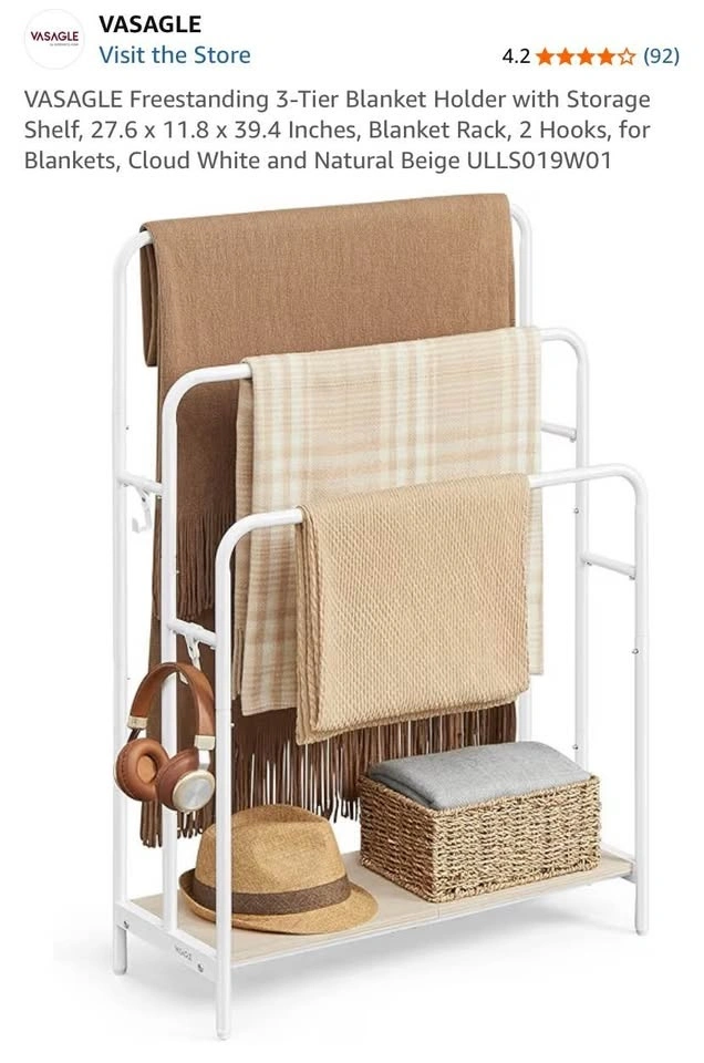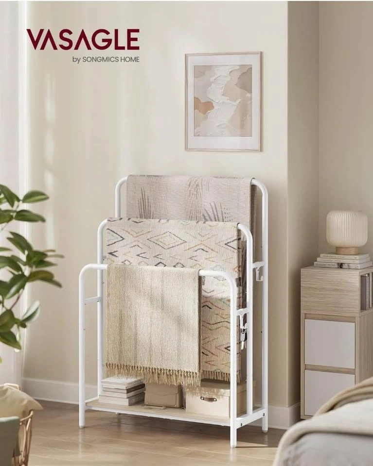 Clean VASAGLE 3-tier blanket rack. Freestanding design with white metal frame and natural beige wood storage shelf. Good for blankets, throws, towels, or clothes. Measures 27.6" W x 11.8" D x 39.4" H. Pick up near Brock Road and Rex Heath Drive in Pickering.