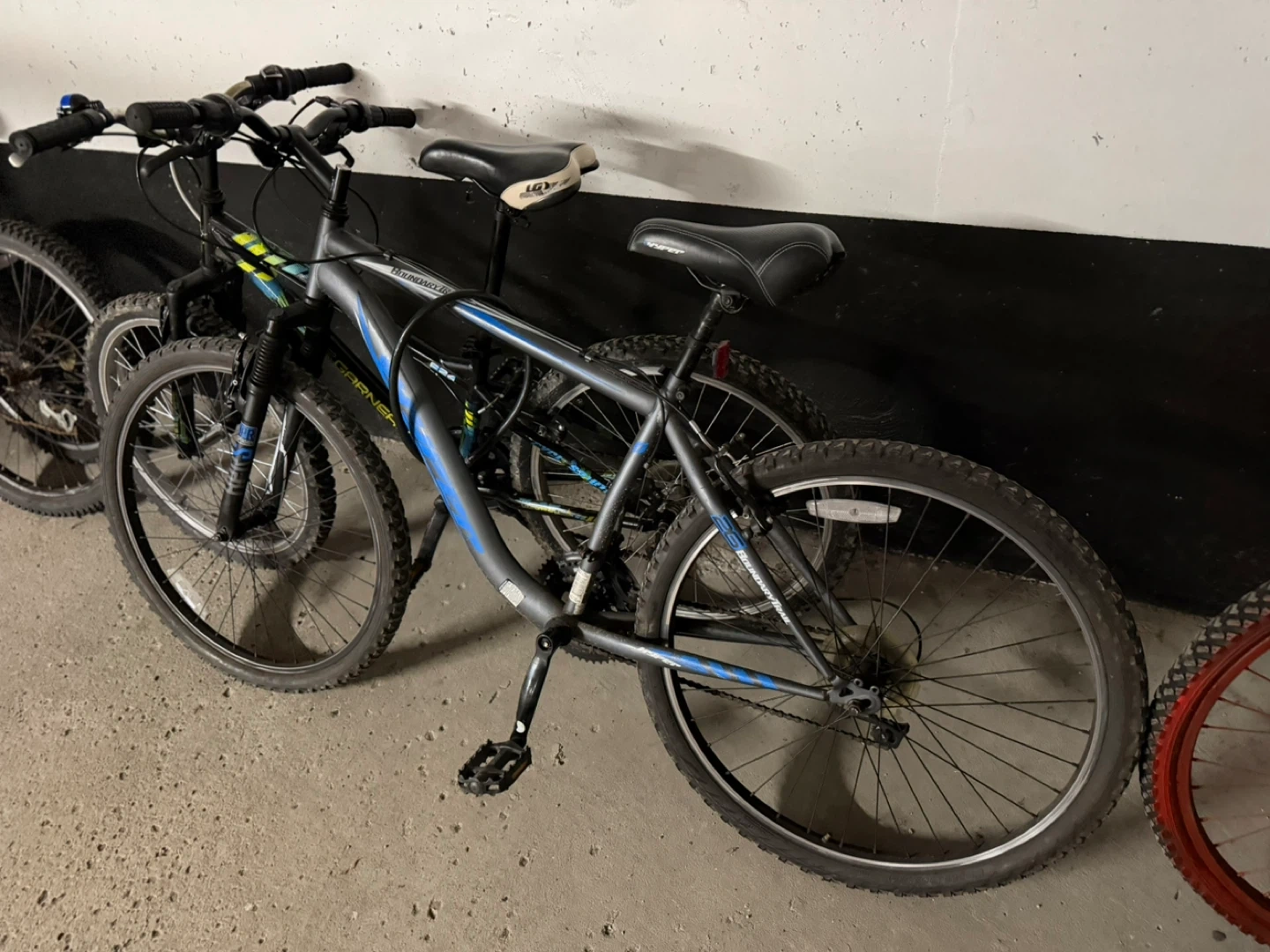 Grey Hyper mountain bike with blue accents. Features a front suspension fork and knobby tires for off-road use. This bike's frame is grey with blue detailing on the frame and wheels. The tires are a standard mountain bike size, suitable for varied terrain.