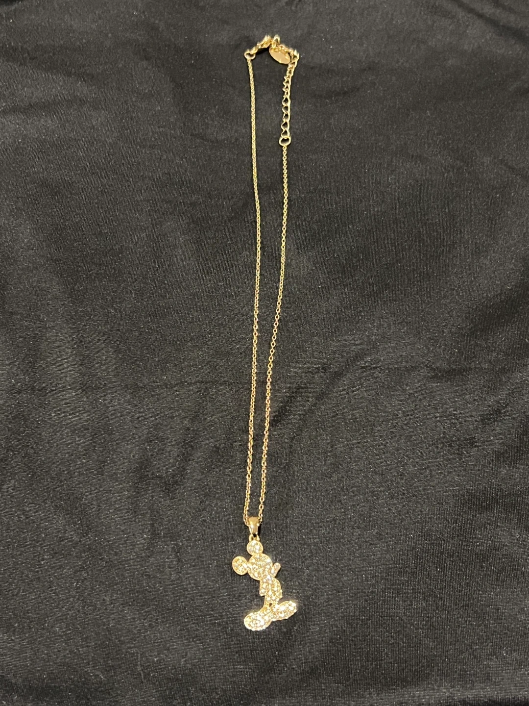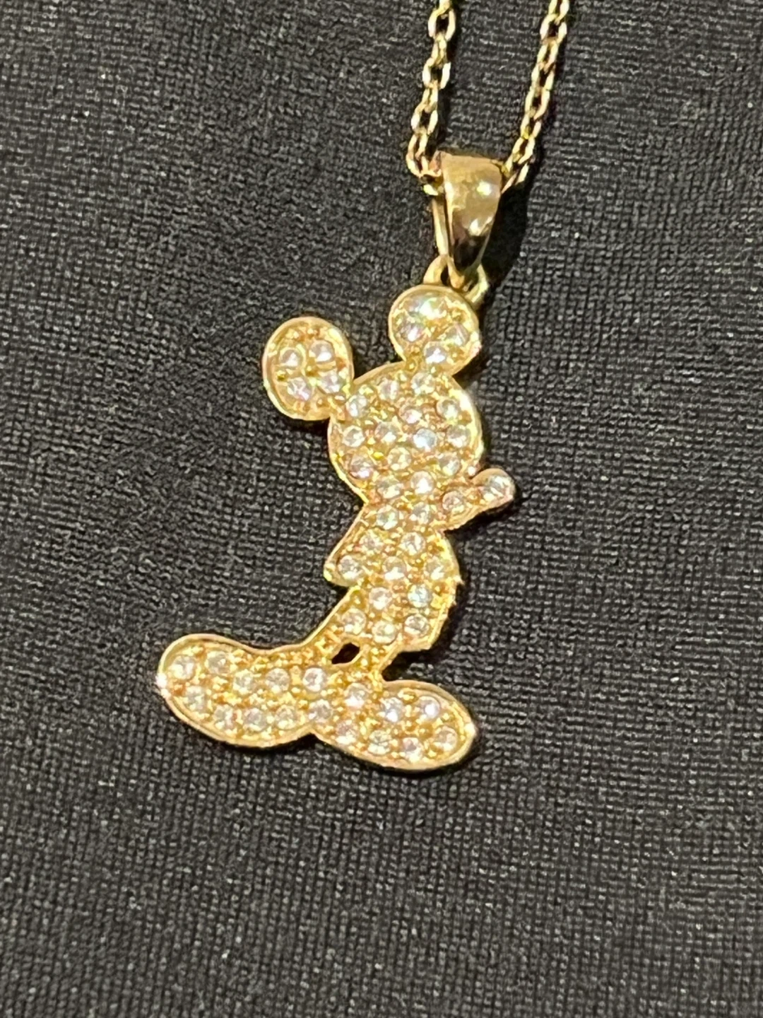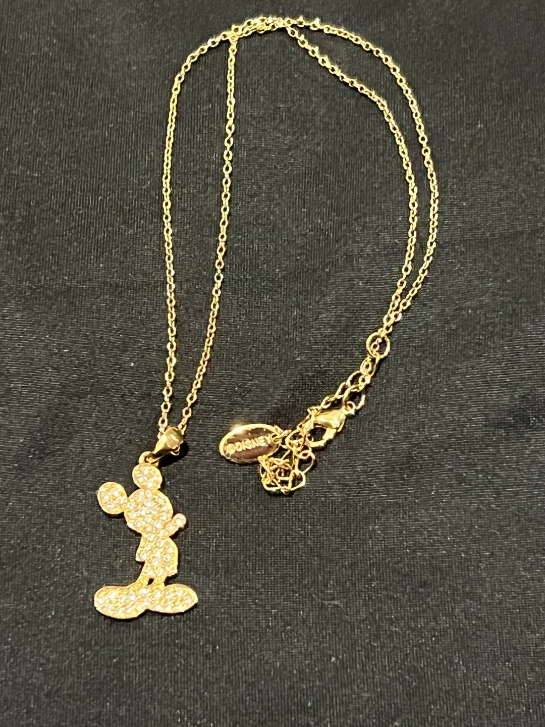 Sparkly Mickey Mouse pendant necklace with a delicate gold-tone chain. Features clear crystals covering the iconic character design. It's an adjustable length necklace.