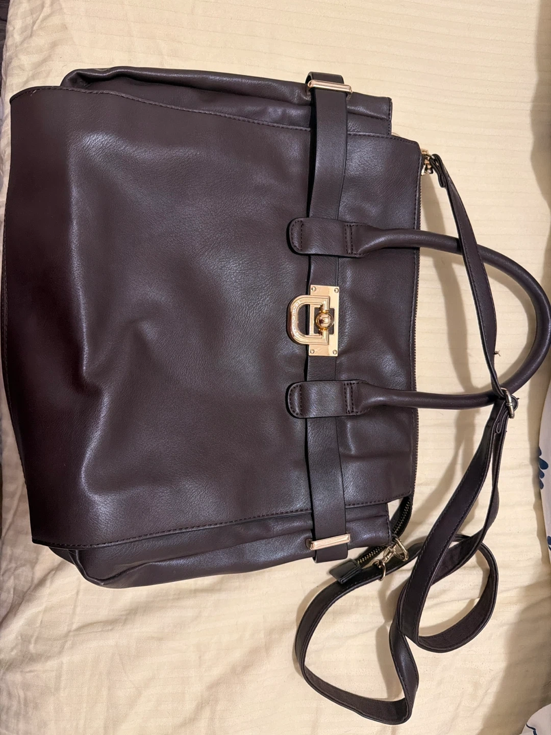 This is a dark brown handbag made from faux leather. It features a secure clasp closure with gold-toned hardware. Comes with a detachable shoulder strap for versatile carrying options. A stylish accessory for everyday use!