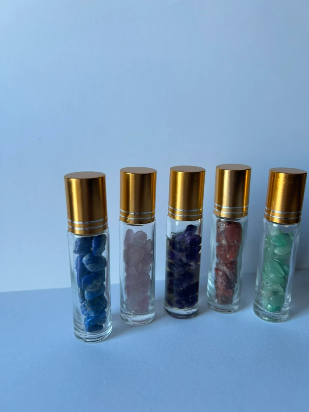Set of five crystal rollerballs, perfect for aromatherapy! Each rollerball is filled with different crystals: lapis lazuli, rose quartz, amethyst, red jasper, and green aventurine. Add your favourite essential oils and enjoy the benefits of both aromatherapy and crystal healing