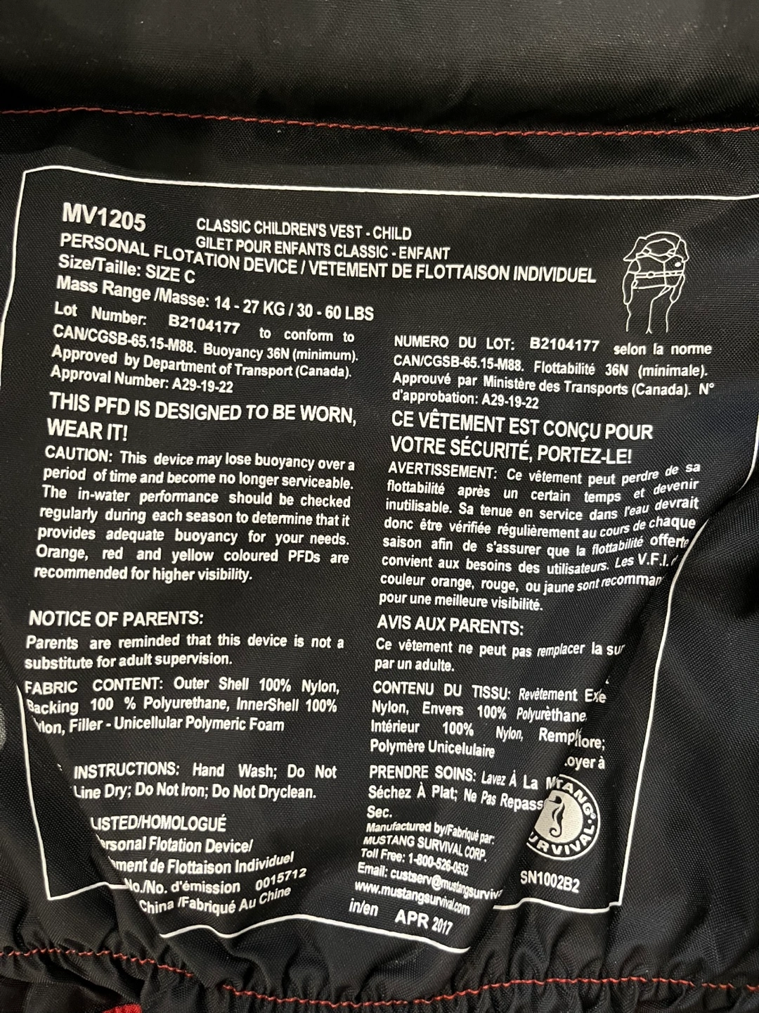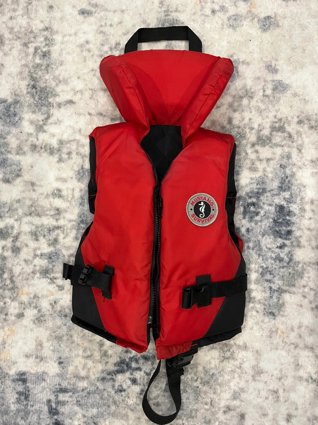Red life jacket with black accents. Size 14. Suitable for children weighing between 27-60 lbs. Has a zipper and two buckles. Comes with a safety whistle.