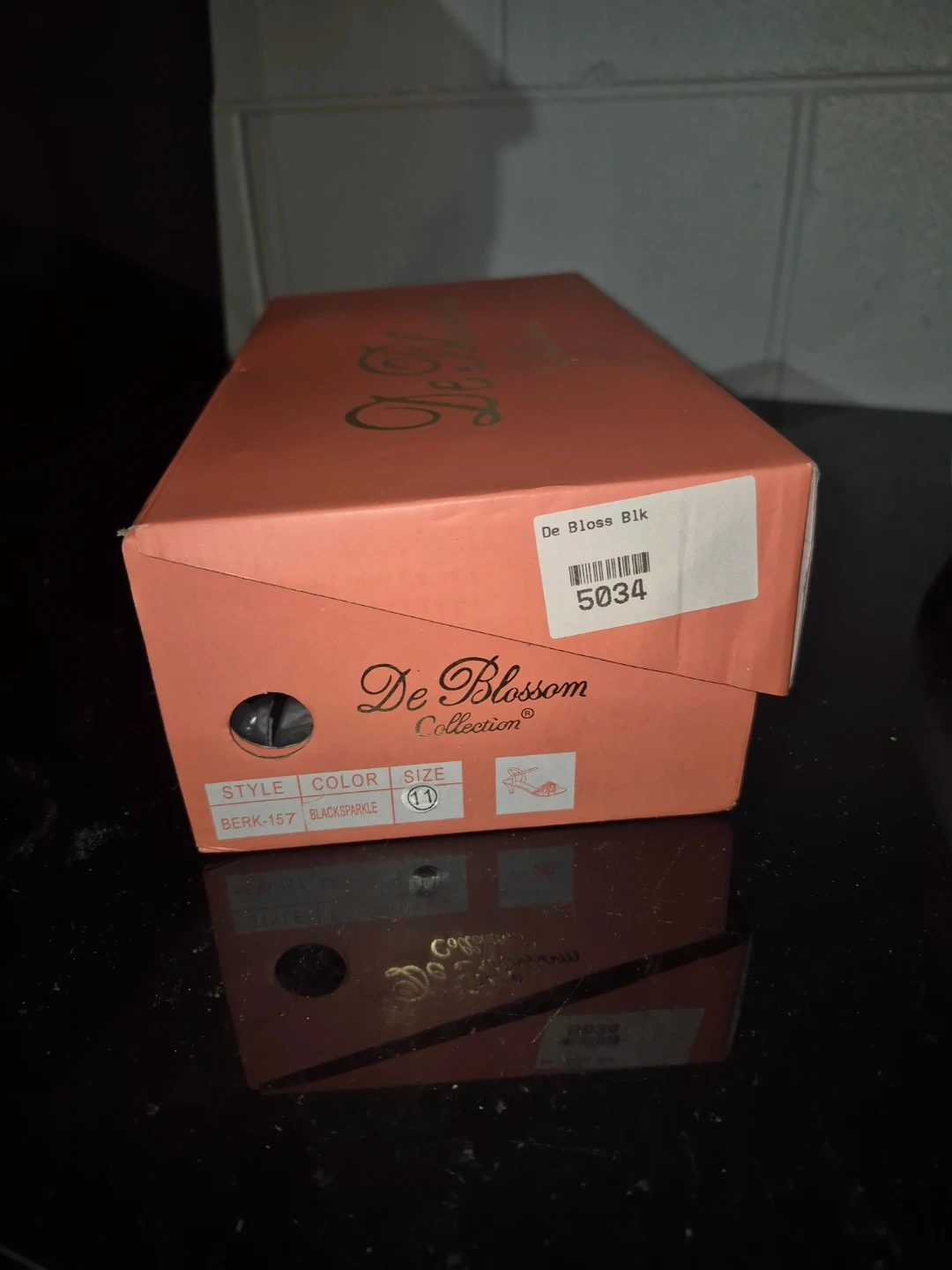 These black sparkle heels from De Blossom Collection come in a size 11. They have a strappy design and a kitten heel. The original box is included. Worn to a couple events and have been stored in box in my closet.