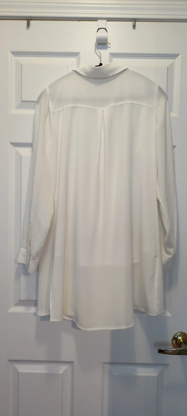 This is a Calvin Klein button-up shirt in off-white. It's a size small. The shirt has a classic collar and long sleeves with button cuffs.