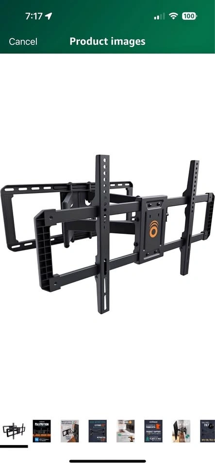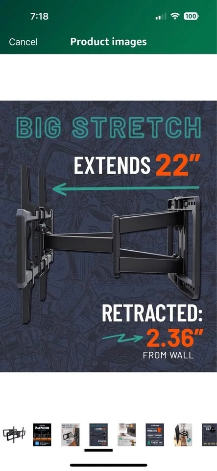 Full motion TV mount for 42 to 90 inch TVs (125lbs). Compatible with all major brands including LG, Sony, Vizio and Samsung. TV size range: 42” – 90”. Weight rating: 125 lbs. Swivel: 130º. Extension: 22". Profile from wall: 2.40". Tilt: 15º down, 5º up. Supported VESA patterns: 200 x 100 to 600 x 400. Post install leveling: +- 3º. Compatible stud width: 16” - 24”. Model: EGLF2.