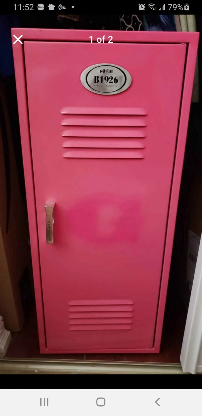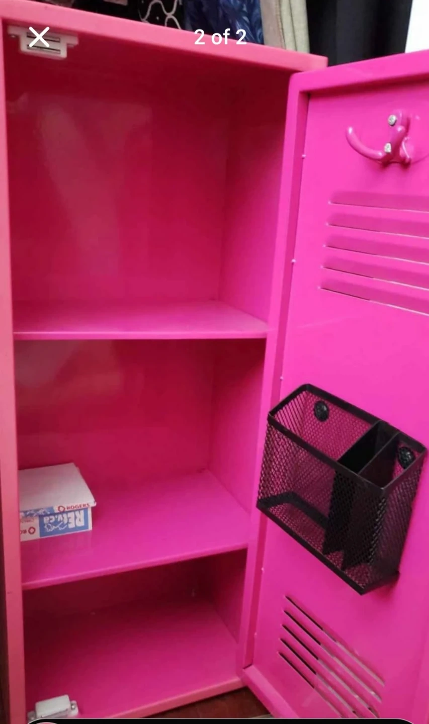 Selling a pink locker, perfect for adding a pop of colour to any room! It has a Form B1926 logo on the front. Inside, you'll find shelves and a wire basket for storage