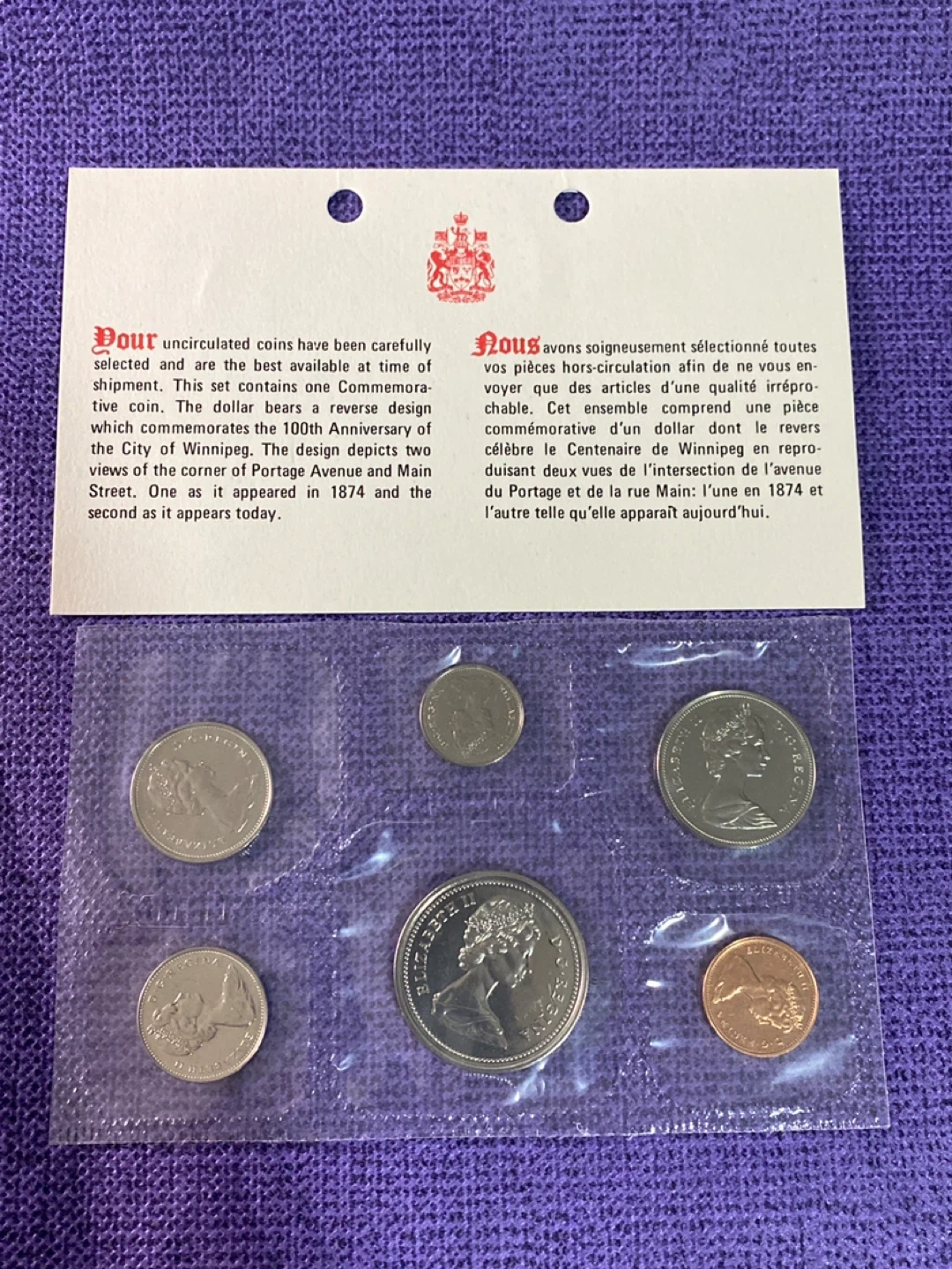 This set contains uncirculated coins, including one commemorative dollar celebrating the 100th Anniversary of the City of Winnipeg. The dollar coin features a reverse design with two views of the corner of Portage Avenue and Main Street, as it appeared in 1874 and today. These are uncirculated coins selected and available at time of shipment. This coin set is perfect for collectors of Canadian numismatics or those interested in Winnipeg's history.