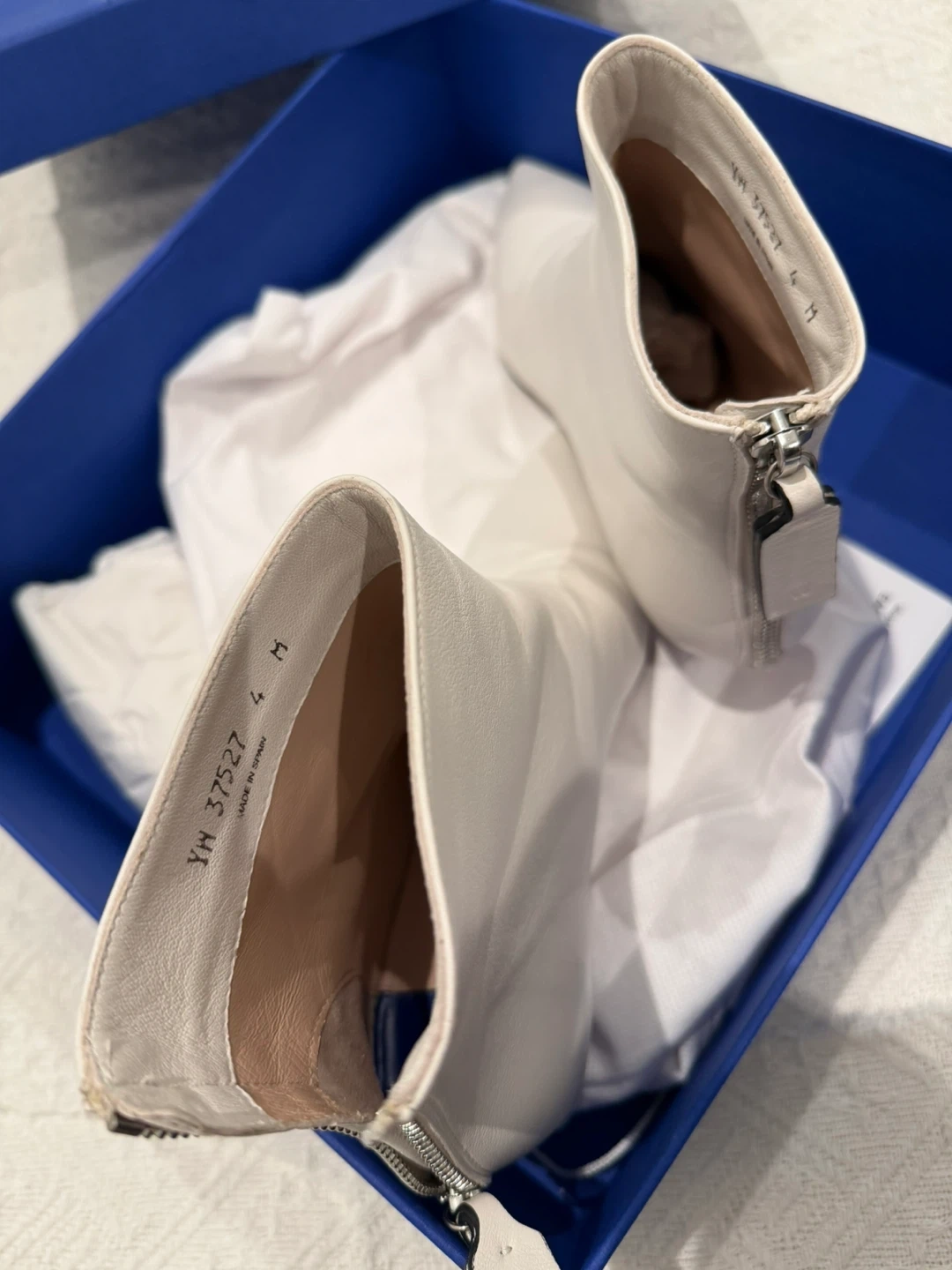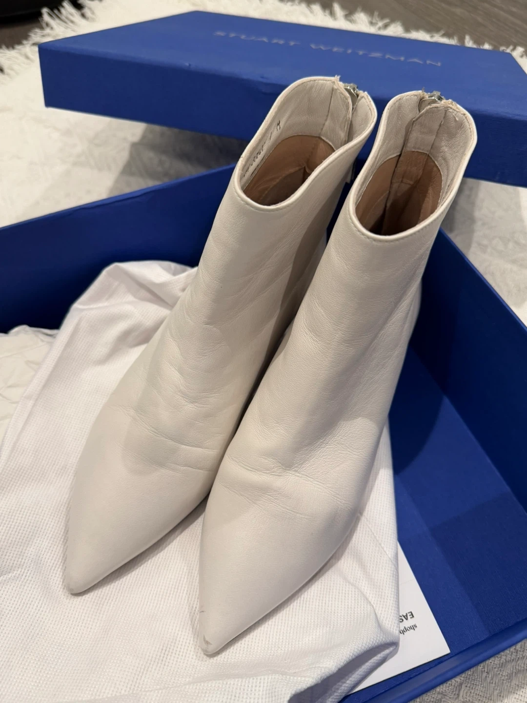 Selling a pair of Stuart Weitzman Kitten Hills booties in size 4. They are a lovely white leather and come with the original box!