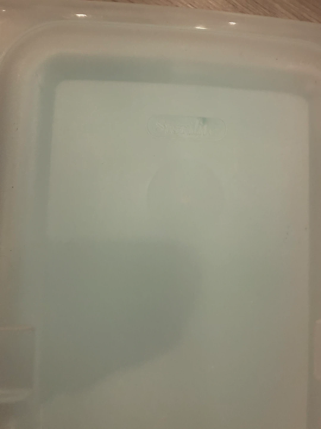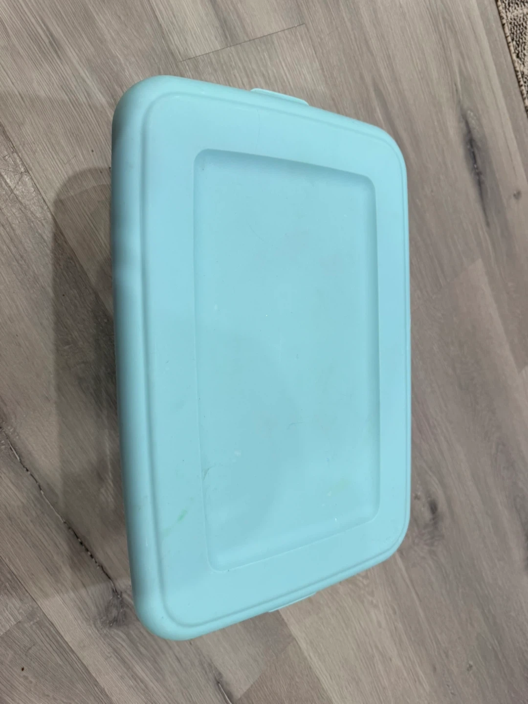 This is a Sterilite plastic storage bin with a light blue lid. It's made of clear plastic so you can see what's inside. Perfect for organizing your home!
