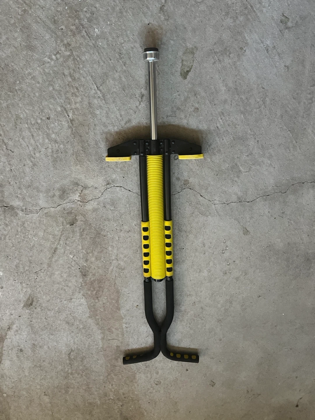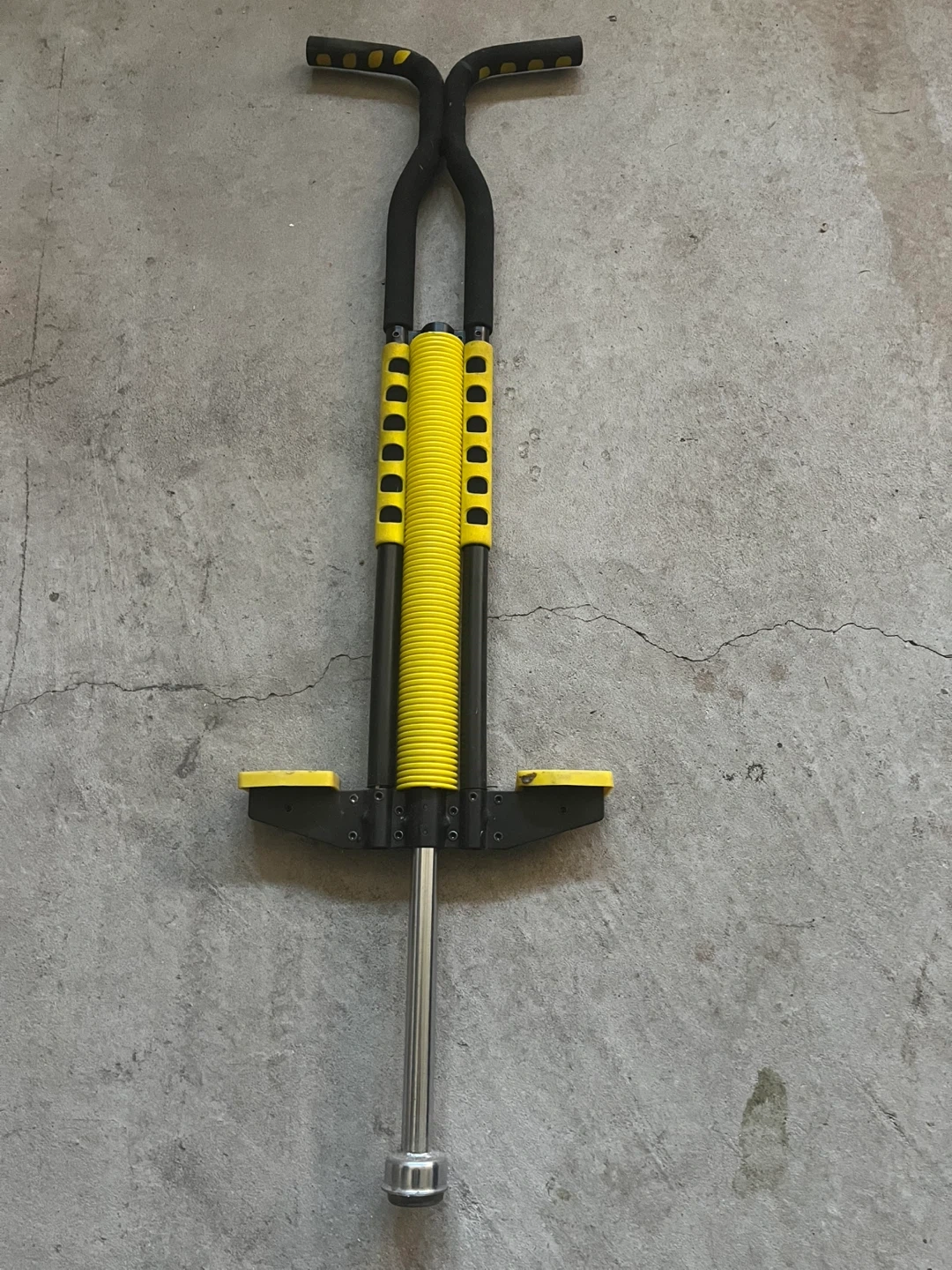 Selling a pogo stick in good condition! It's yellow and black, perfect for some outdoor fun. Get ready to bounce around!
