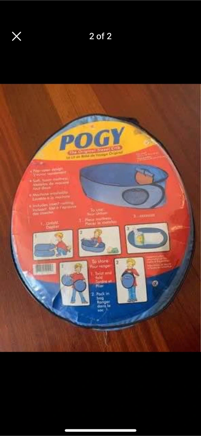Selling a POGY The Original Travel Crib. It features a pop-open design, a soft foam mattress, and is machine washable. It also includes insect netting. The full size is 39"L x 18"W x 18"D (97.5 cm x 45 cm x 45 cm). It's easy to unfold, place the mattress, and pack away by twisting and folding into its bag