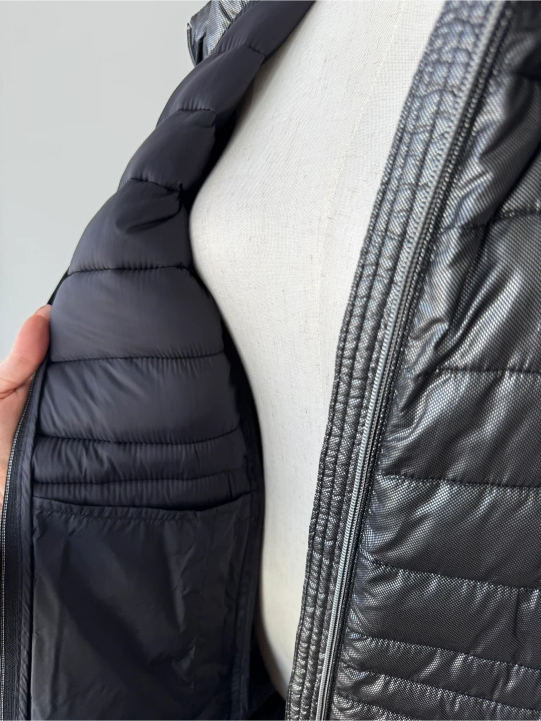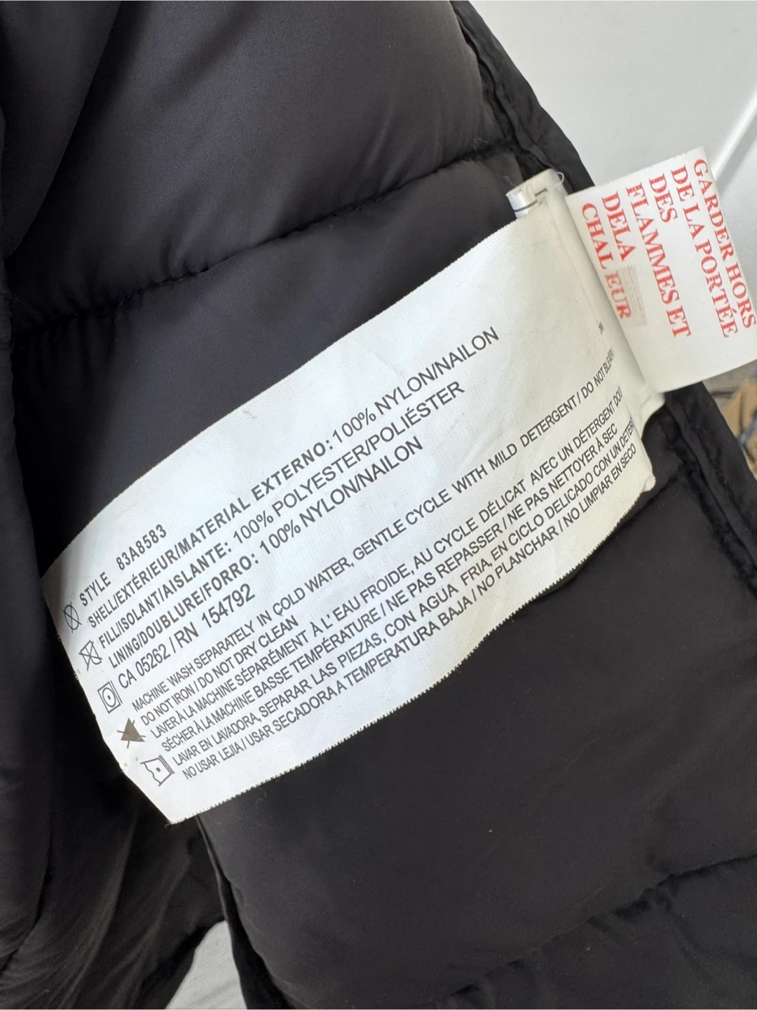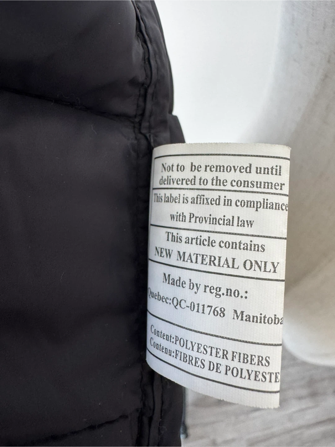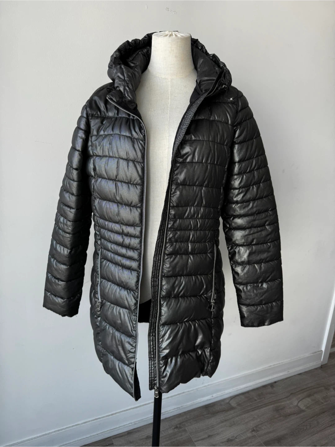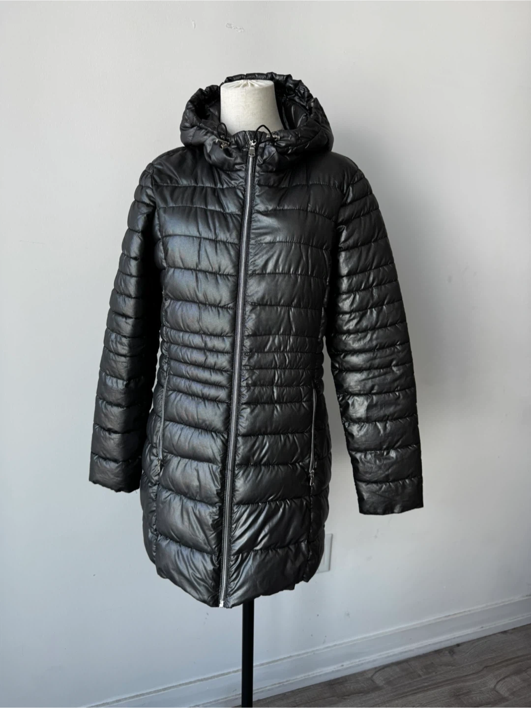 Cozy black puffer jacket from POINT Weather Supply, perfect for those chilly days! It's a size M, and has a hood for extra warmth and protection from the elements. The jacket is in great condition and ready for a new home!