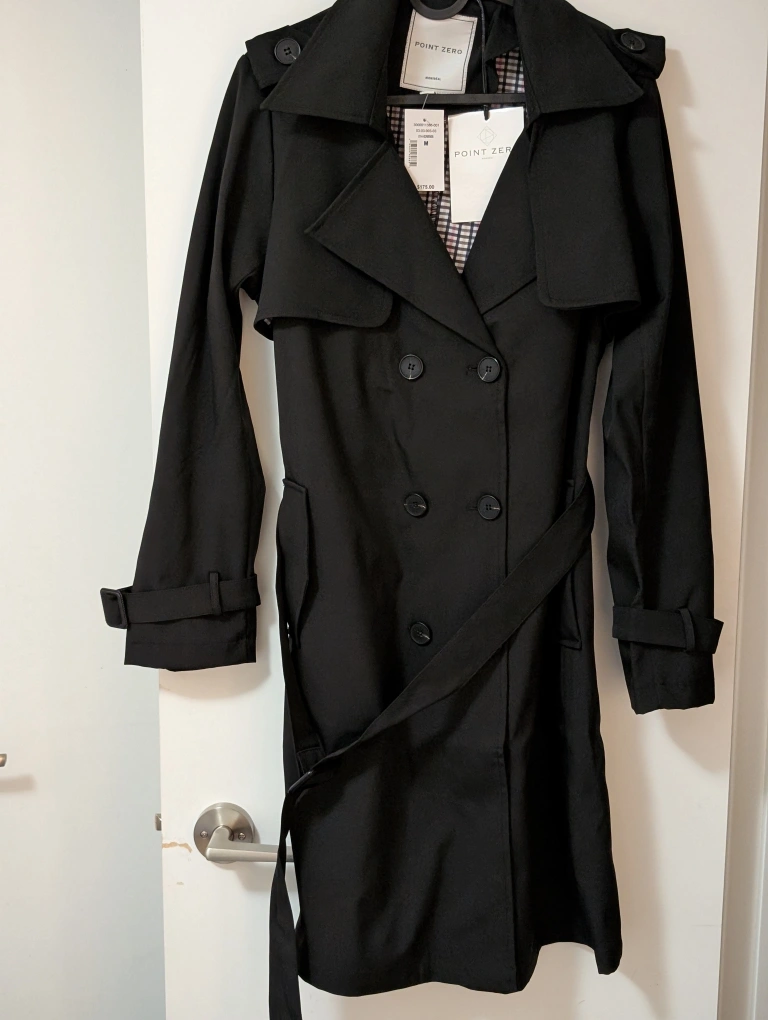 Selling a stylish long black trench coat from Point Zero in size M. It's new and ready for a new home. Perfect for those cooler fall days!