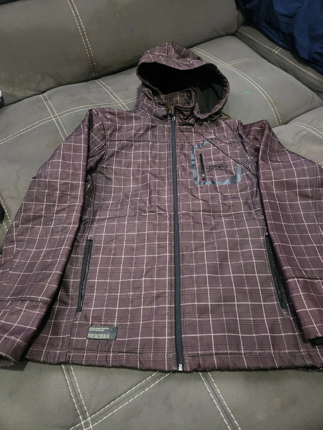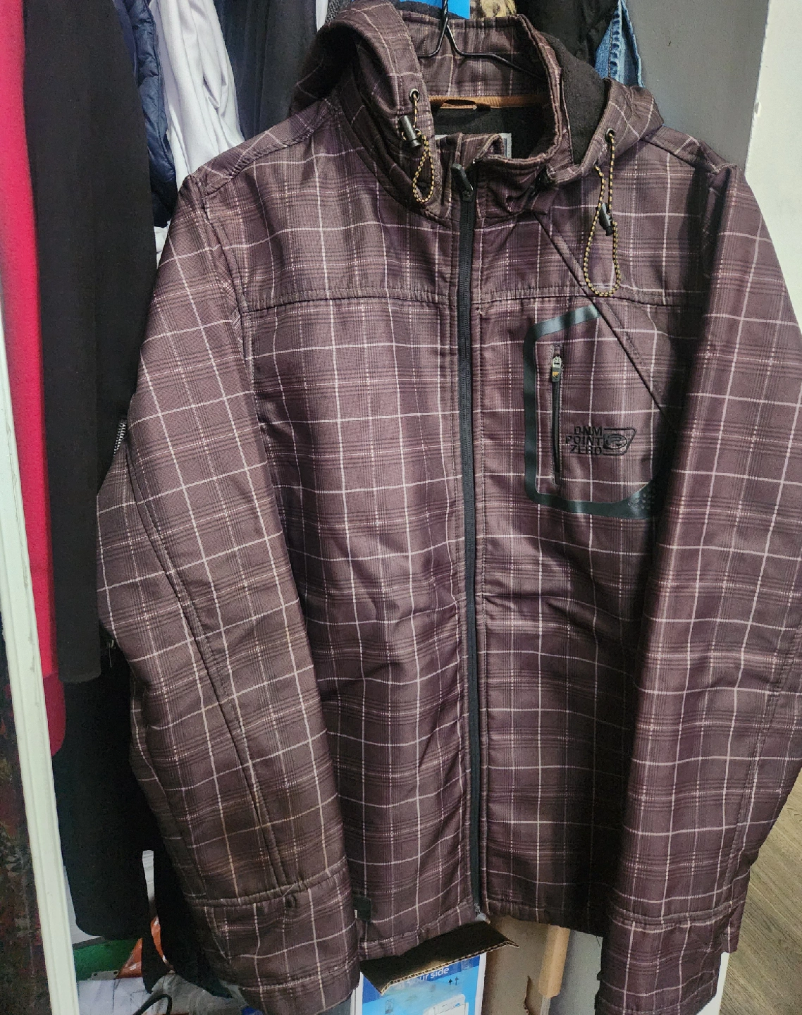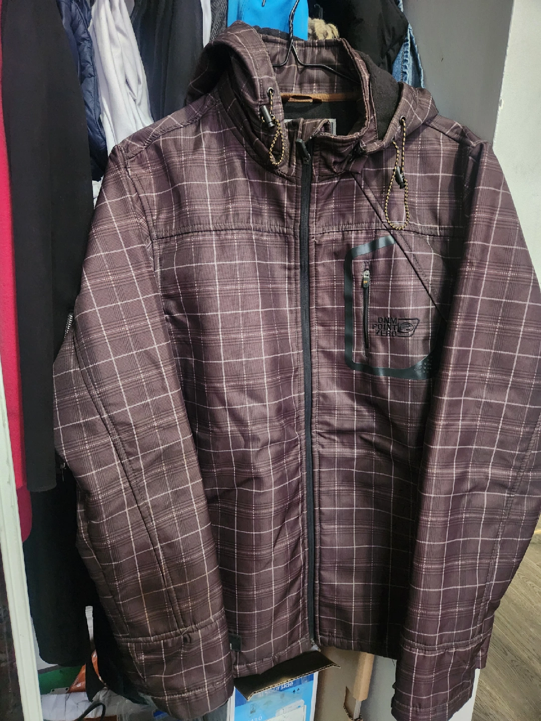18Here's a Point Zero jacket with a cool plaid pattern! It's brown with a hood, perfect for those in-between weather days. Has a zip pocket on the front too!