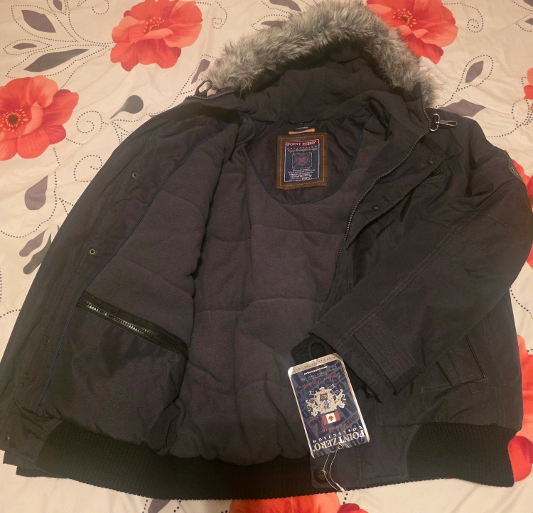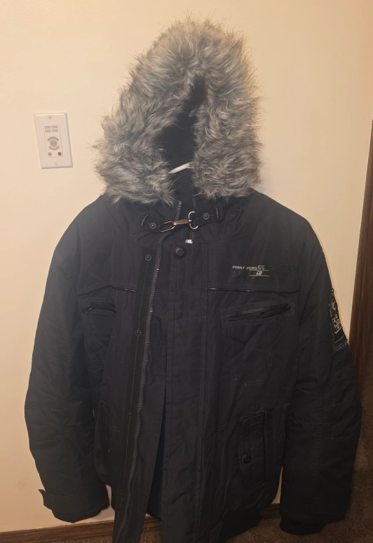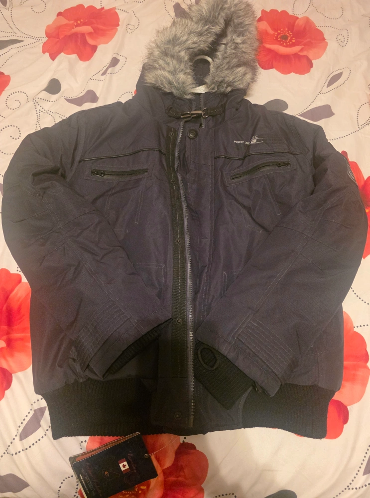 60Here's a Point Zero padded winter jacket! It's perfect for staying warm during the cold Canadian winters. It features a faux fur-trimmed hood and lots of pockets!