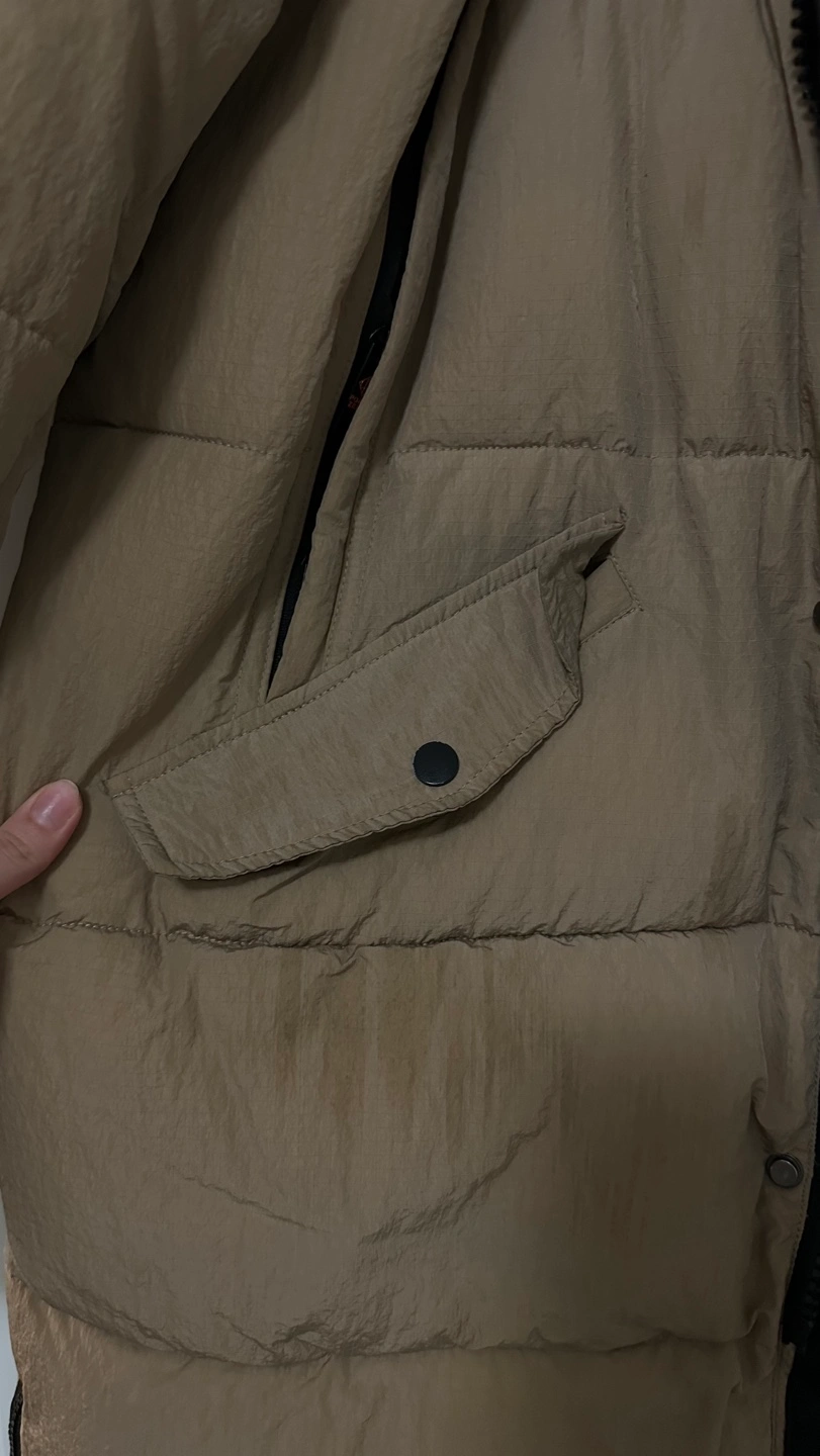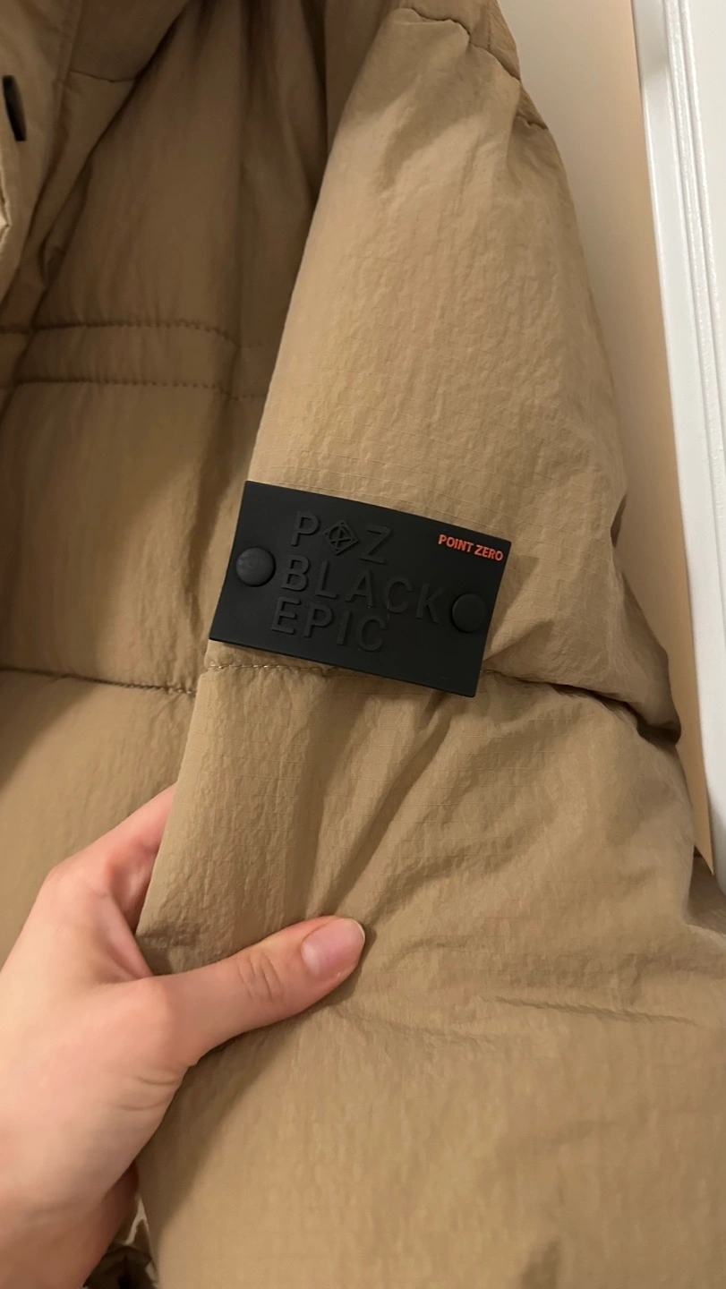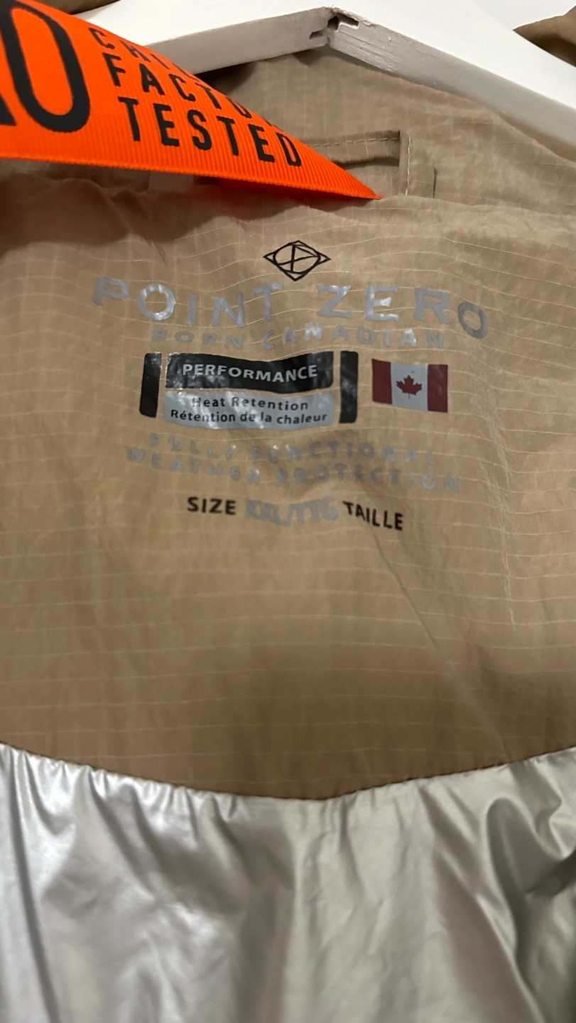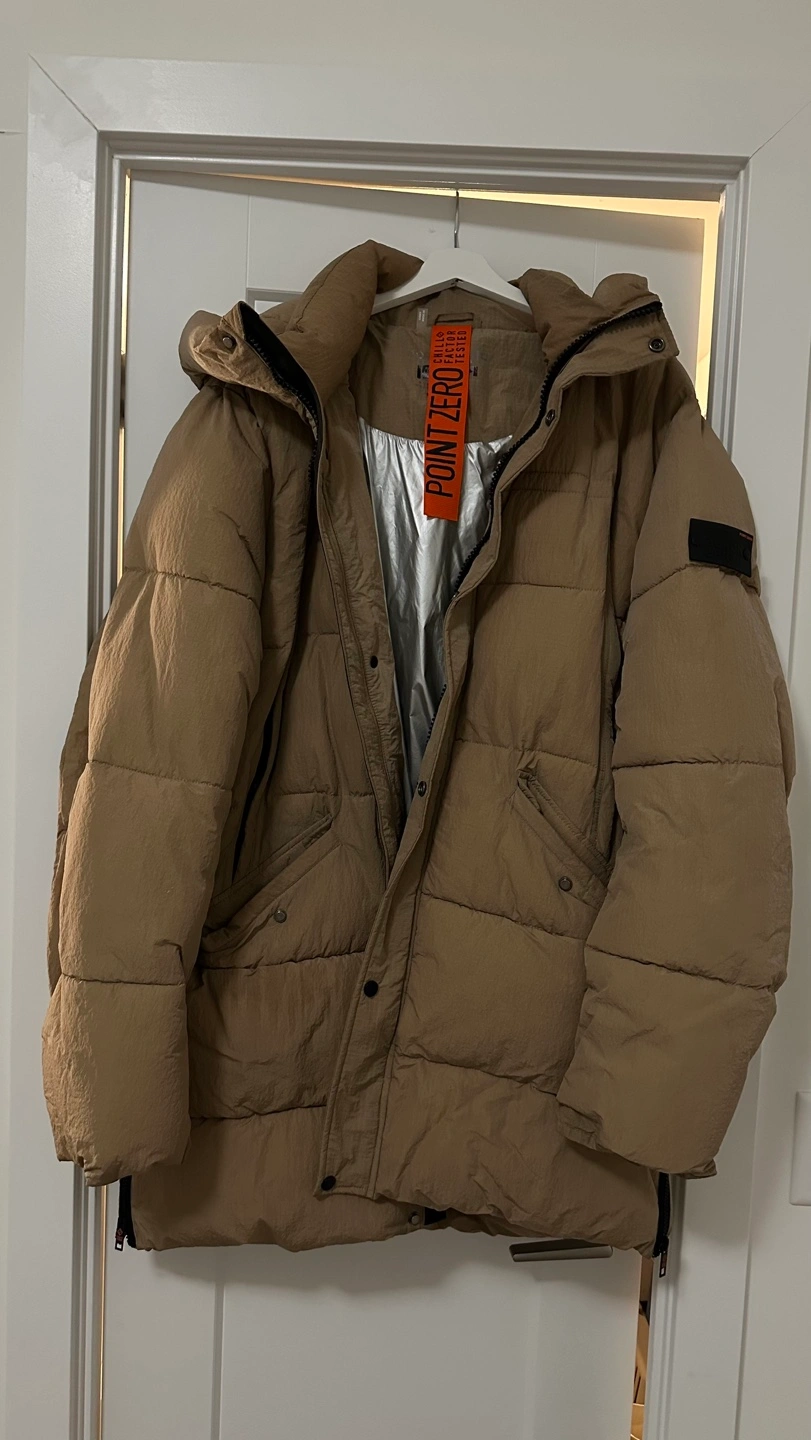 159Brown puffer jacket with a hood. Features a silver reflective lining. Size is on the tag.