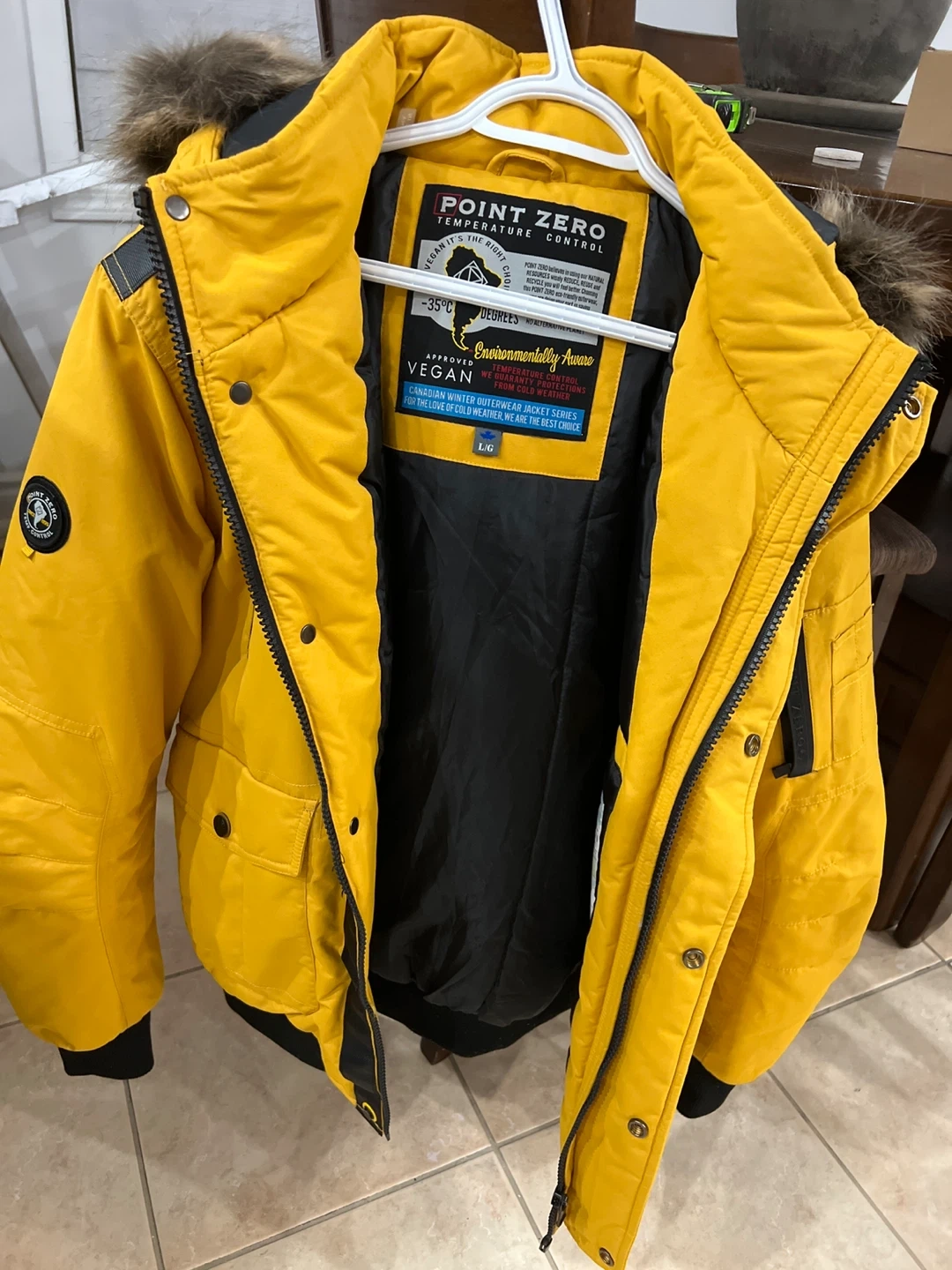 10Stay warm this winter with this Point Zero jacket! It's a size L and ready to keep you cozy in the cold. The jacket is approved vegan and designed for temperatures down to -35°C. It's part of the Canadian Winter Outerwear Jacket Series, so you know it's built for Canadian winters