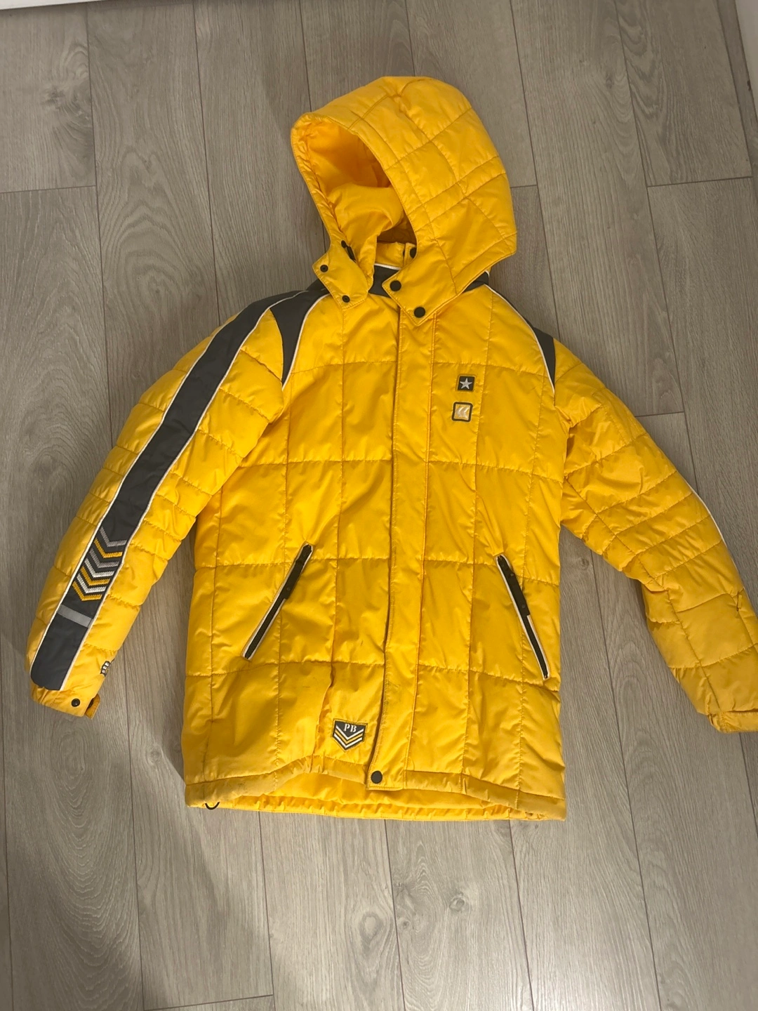 Boys' Poivre Blanc ski jacket. Size 14. Yellow with grey accents. Features a hood. Quilted design. Good condition.