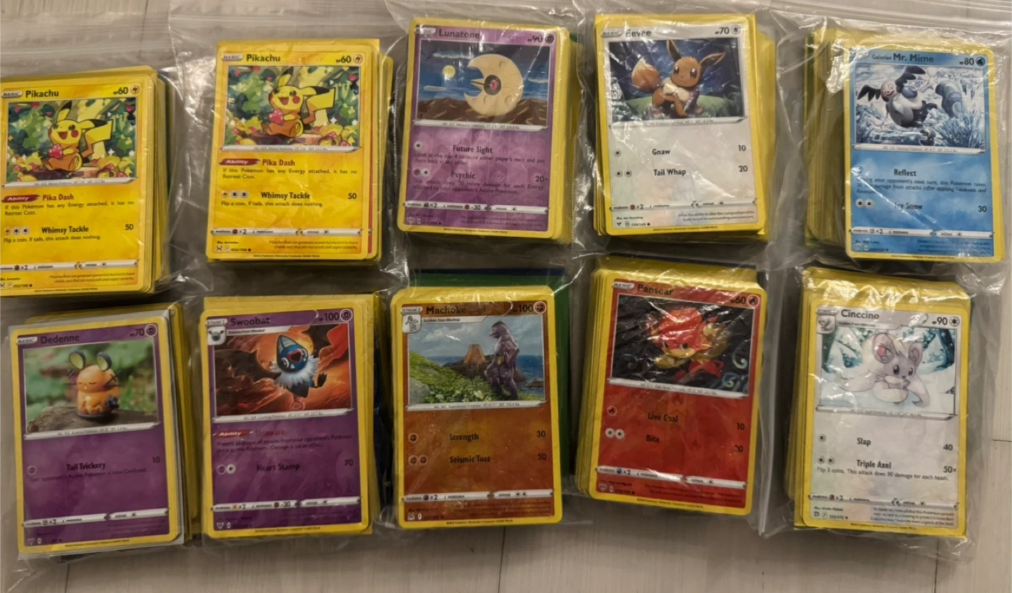 187$3 each bag cash only There are 18 bags available Each bag contains 55 cards which include commons, trainers, energies and a few holo or reverse holo cards. No going through individual bags to pick cards out as they are random. Perfect for loot bags, Halloween or even Christmas.