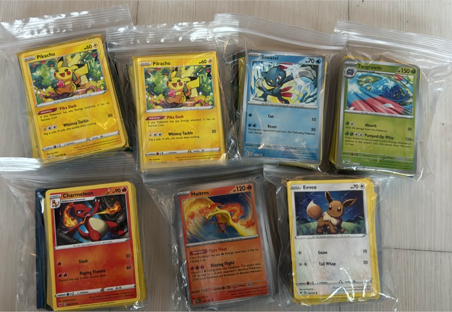 187$3 each bag cash only There are 21 bags available Each bag contains 55 cards which include commons, trainers, energies and a few holo or reverse holo cards with some card sleeves included. No going through individual bags to pick cards out as they are random. Perfect for loot bags, new collector or even Christmas.