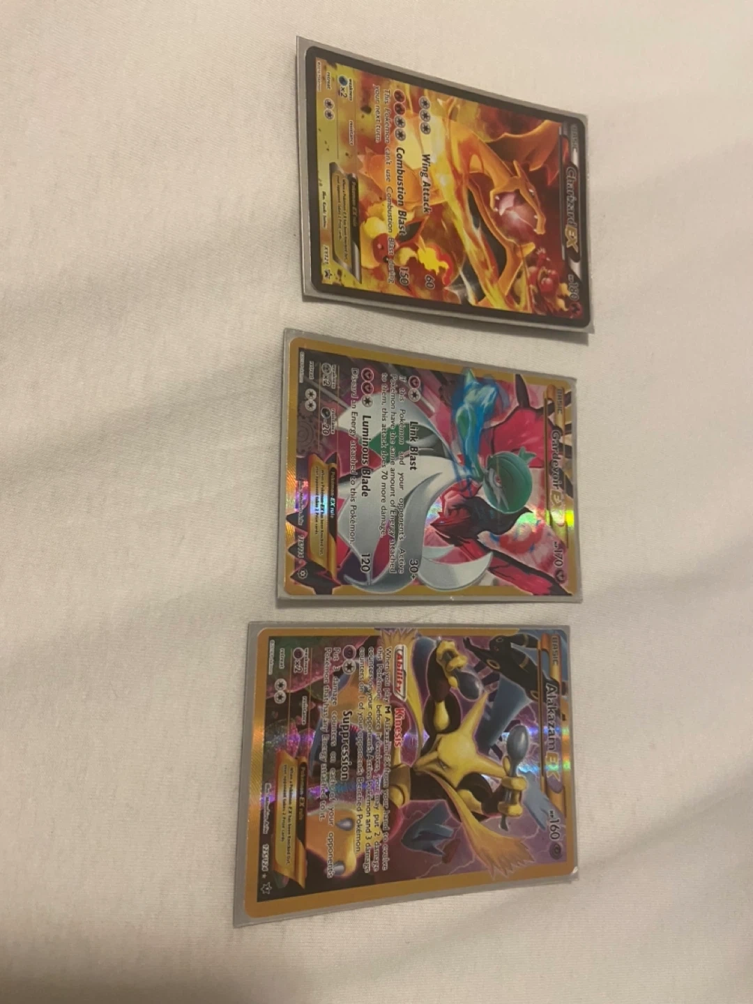 Selling three Pokémon cards: Charizard EX, Gardevoir EX, and Alakazam EX! The charizard ex is in good condition but the other ones are like new
