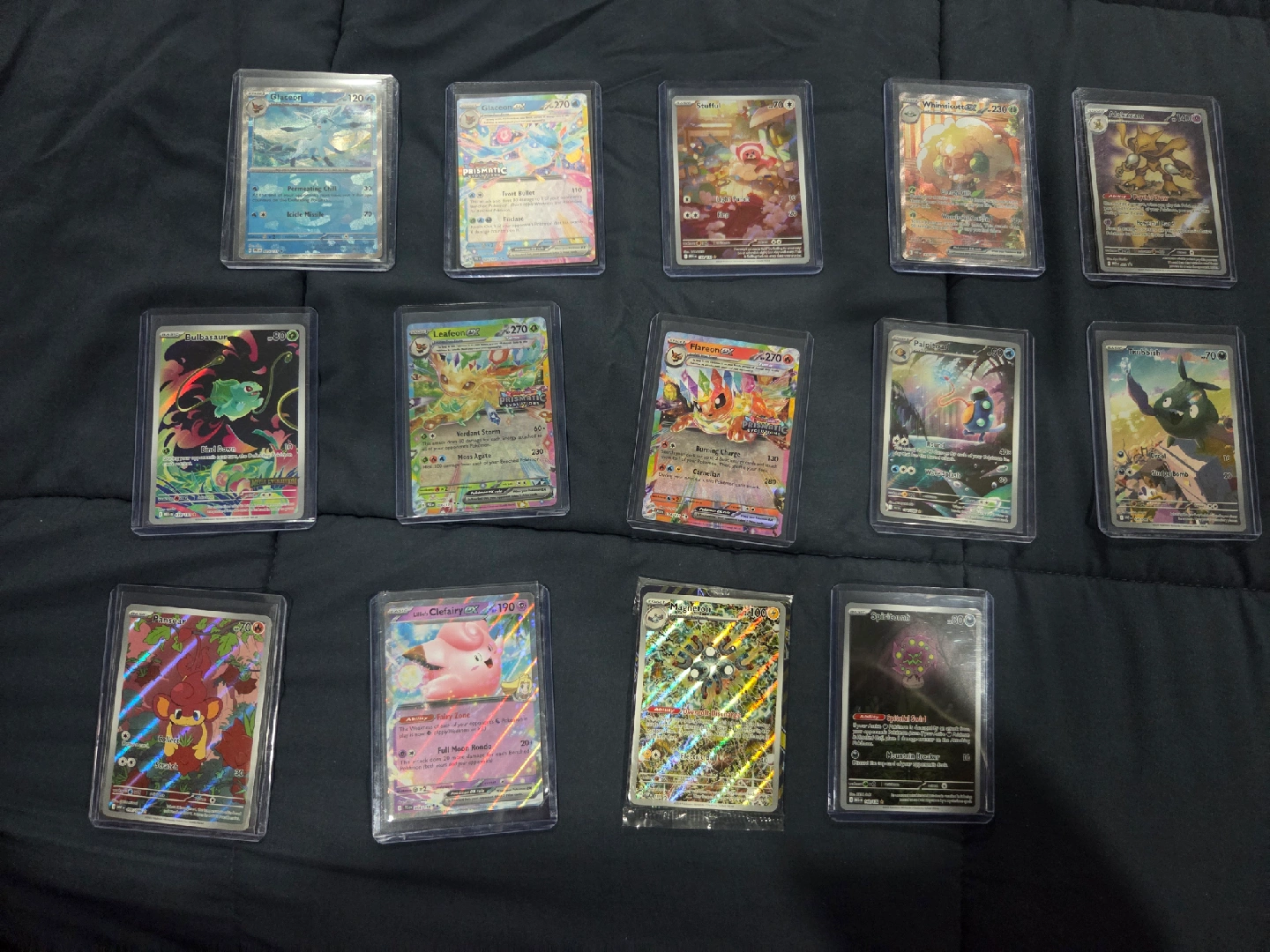 Selling a collection of Pokémon cards! Includes Glaceon, Leafeon, Flareon, and others. All cards are in protective sleeves. Great for collectors! all mint condition all just below what the price of each card is