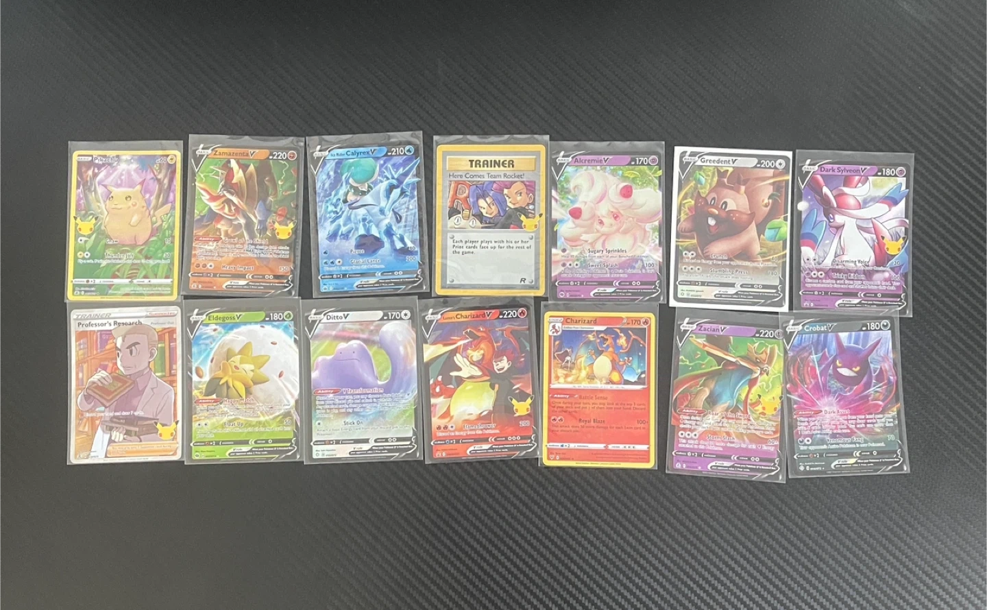 Selling a collection of Pokémon Celebrations cards! Includes Pikachu, Charizard, Zamazenta, Calyrex, Alcremie, Greedent, Dark Sylveon, Professor's Research, Eldegoss, Ditto, Zacian, and Crobat. All cards are in great condition and ready for a new home. Perfect for collectors or players!