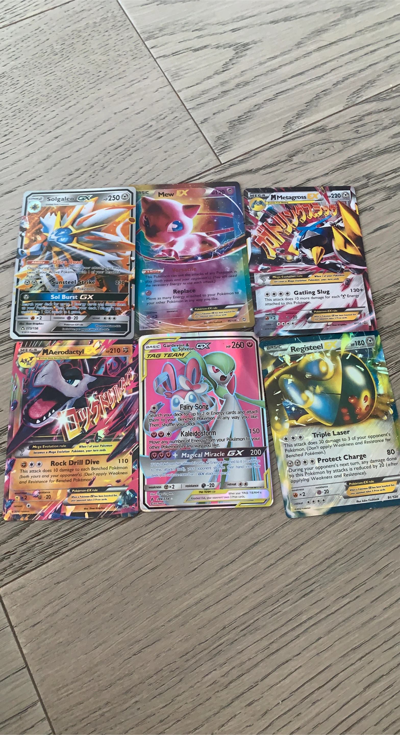 Selling a collection of Pokémon cards including GX, EX, and Tag Team cards. The cards feature characters like Solgaleo GX, Mew EX, Mega Metagross EX, Mega Aerodactyl EX, Gardevoir & Sylveon GX, and Registeel. Great for collectors or players!