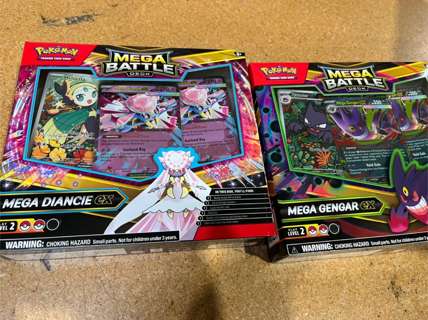 21Selling two Pokémon Mega Battle Decks! One is Mega Diancie EX and the other is Mega Gengar EX. In each box, you'll find: - A ready-to-play 60-card deck - A set of damage counters - A large metallic coin - A deck box - A double-sided playmat and strategy sheet - A code card to play this deck online