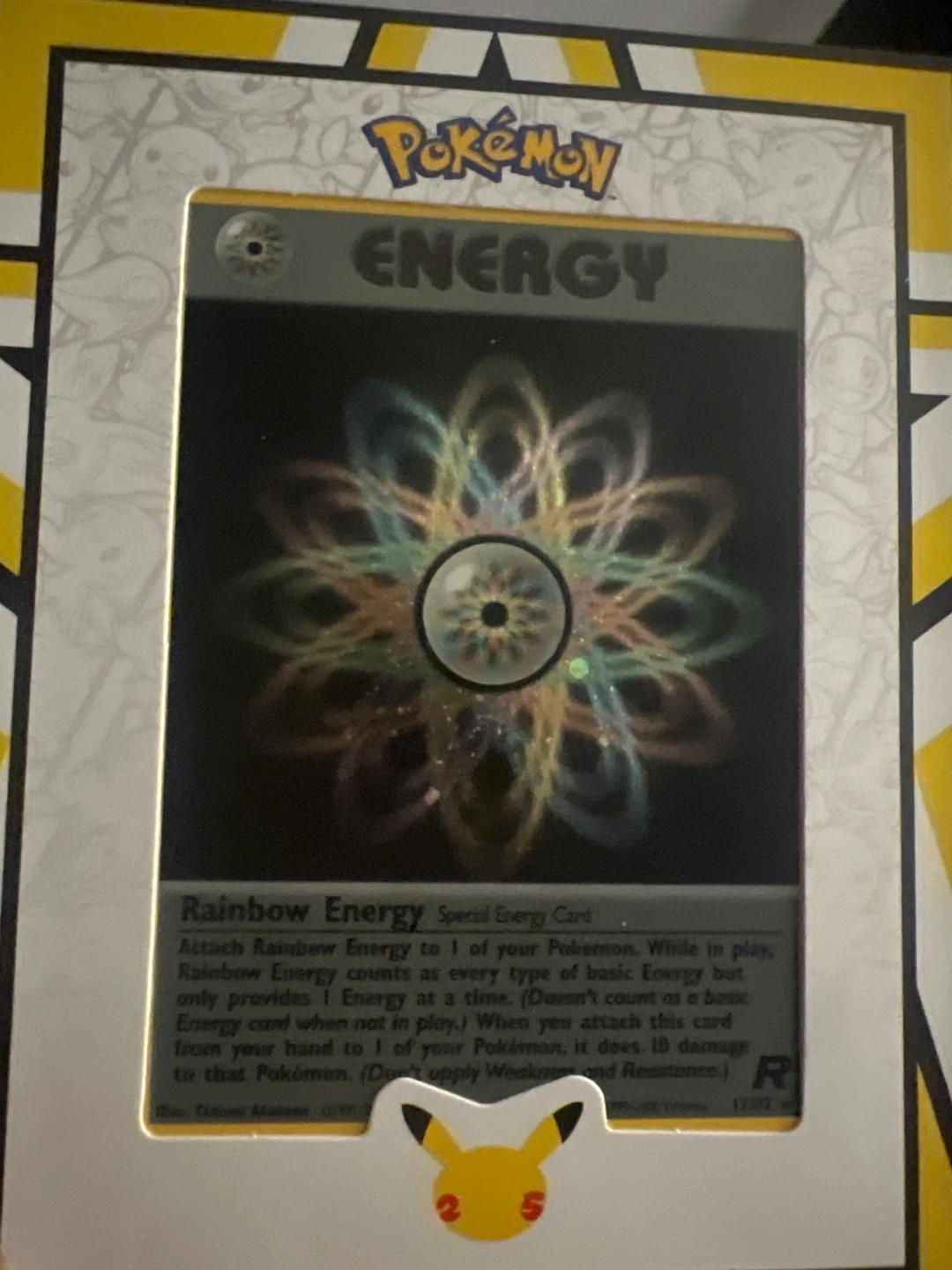 10Selling a Pokémon Rainbow Energy Special card! It attaches Rainbow Energy to one of your Pokémon. While in play, Rainbow Energy counts as every type of basic Energy but only provides 1 Energy at a time. When you attach this card from your hand to one of your Pokémon, it does 10 damage to that Pokémon