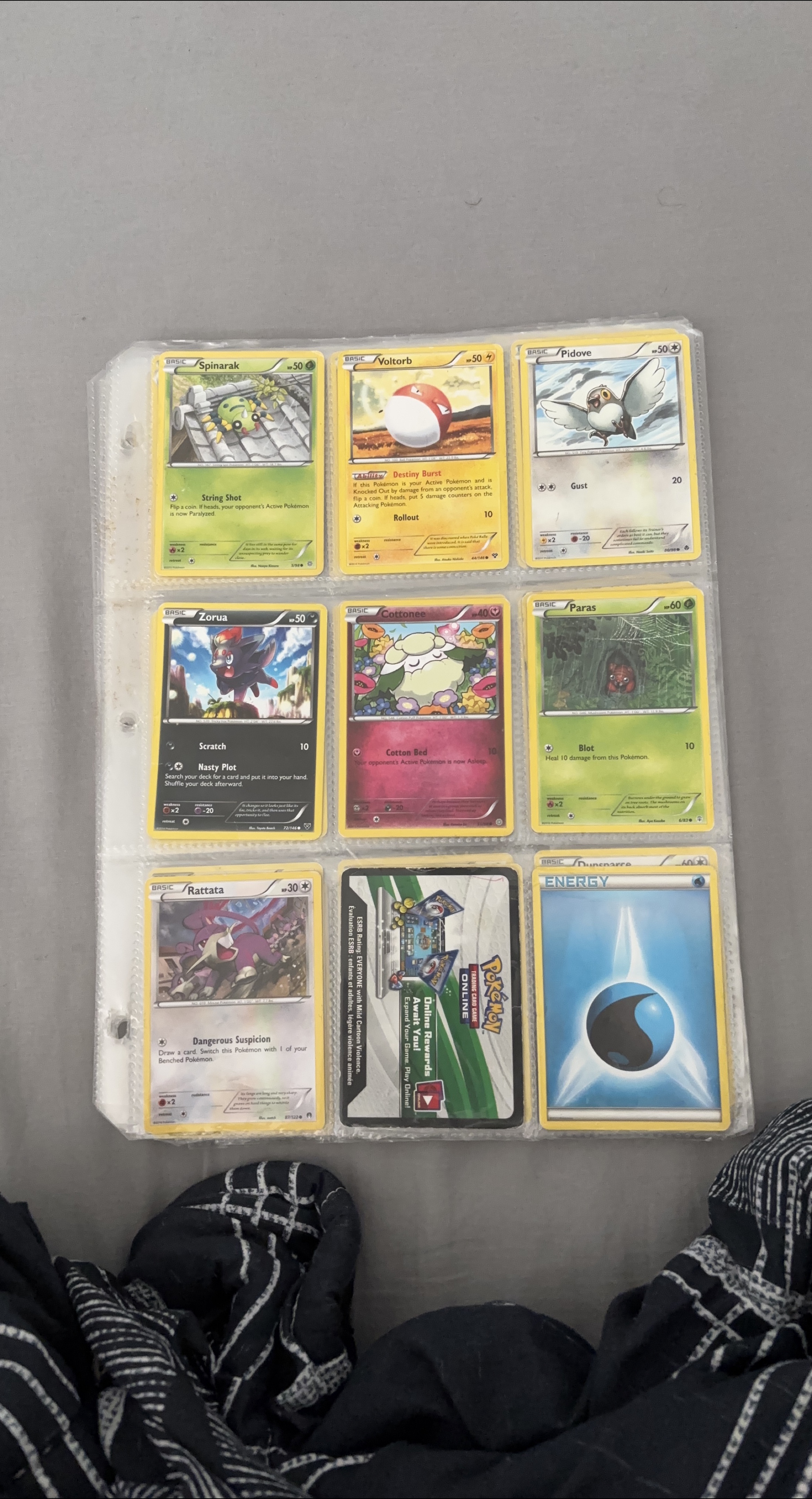 Selling a collection of Pokémon trading cards! You'll find classics like Spinarak, Voltorb, Pidove, Zorua, Cottonee, Paras, Rattata, and a basic Energy card. Perfect for any collector or player looking to expand their deck