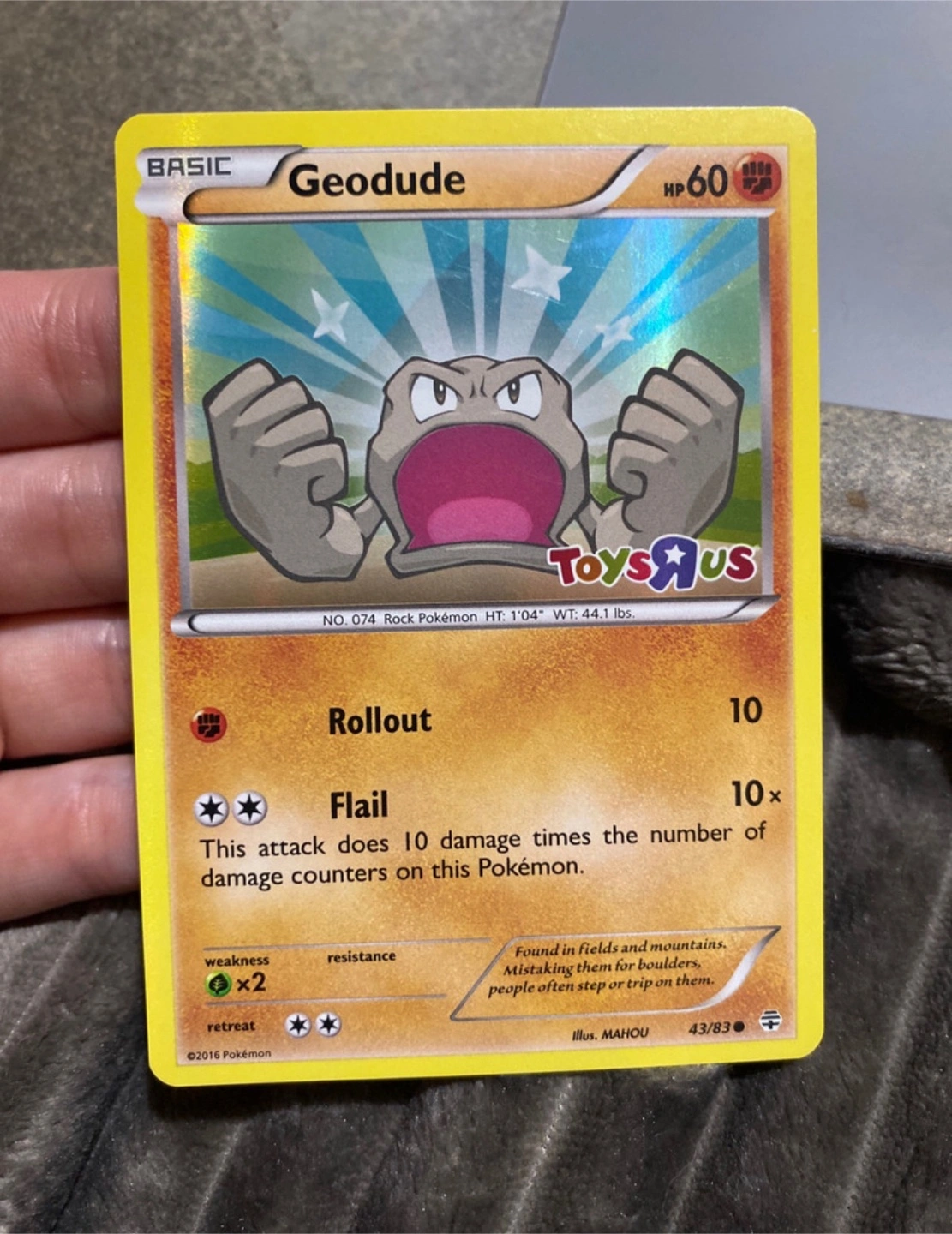 Pokemon card featuring Geodude. Number 43/83. Toys R Us promo card. Basic Pokemon card. Good condition