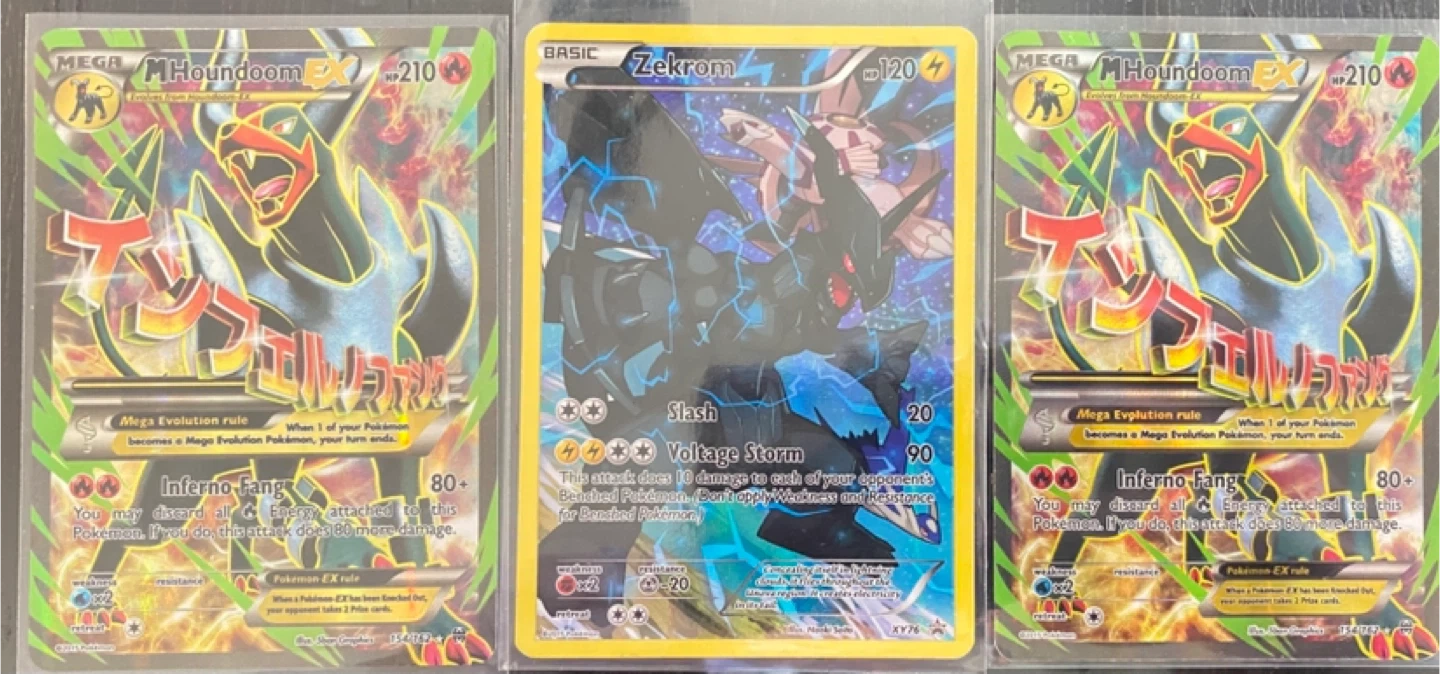 Selling a couple of Pokemon cards! Includes Mega Houndoom EX with 210 HP and Zekrom with 120 HP. Both cards have some cool attacks like Inferno Fang and Voltage Storm, respectively