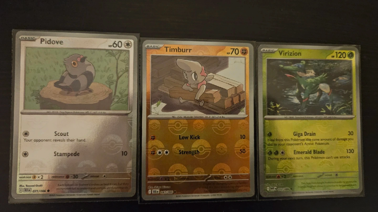 34trade three pokeball Pokemon cards: Pidove, Timburr, and Virizion. They're in great shape and ready for a new home! Check out the pictures for details