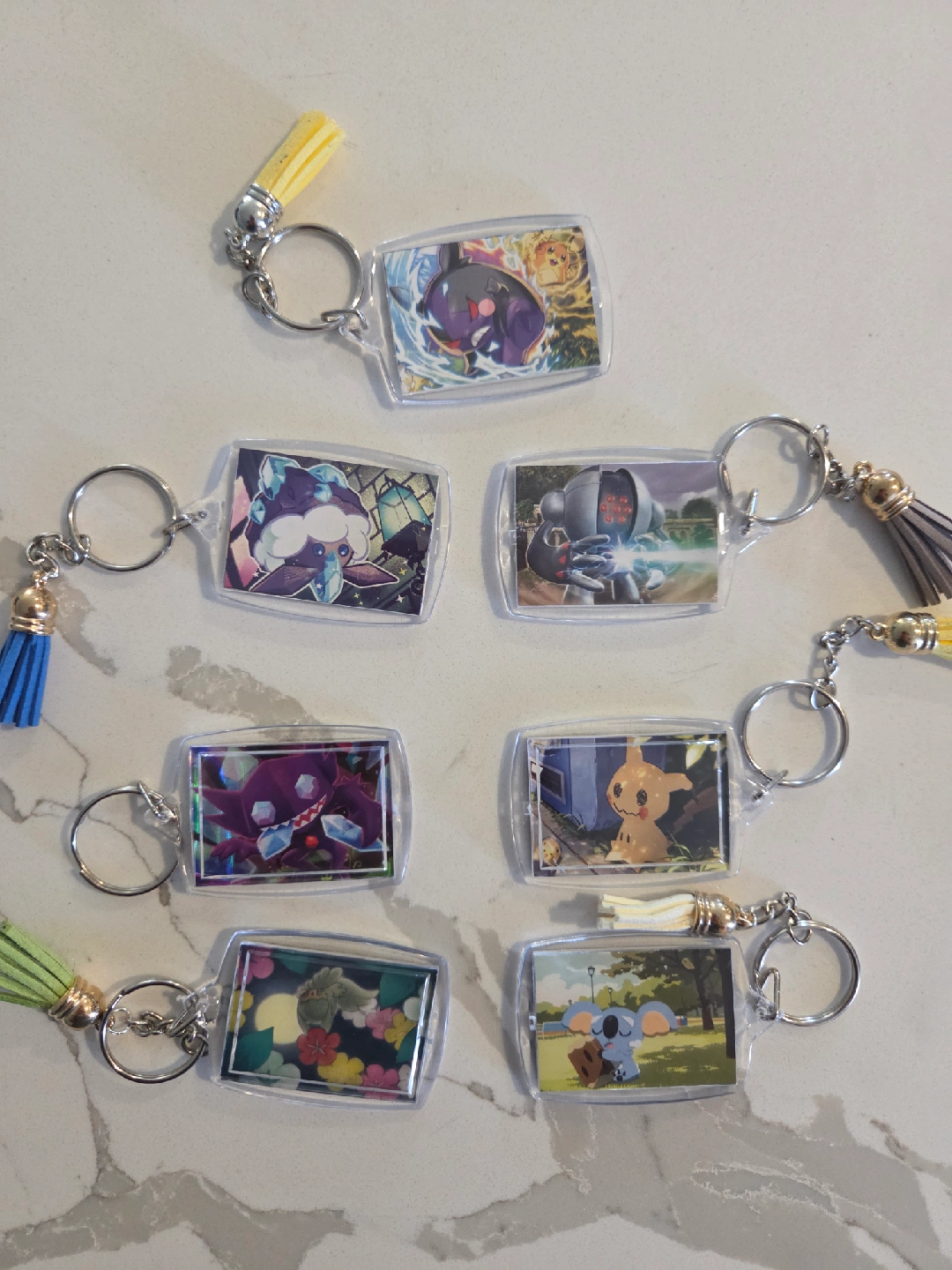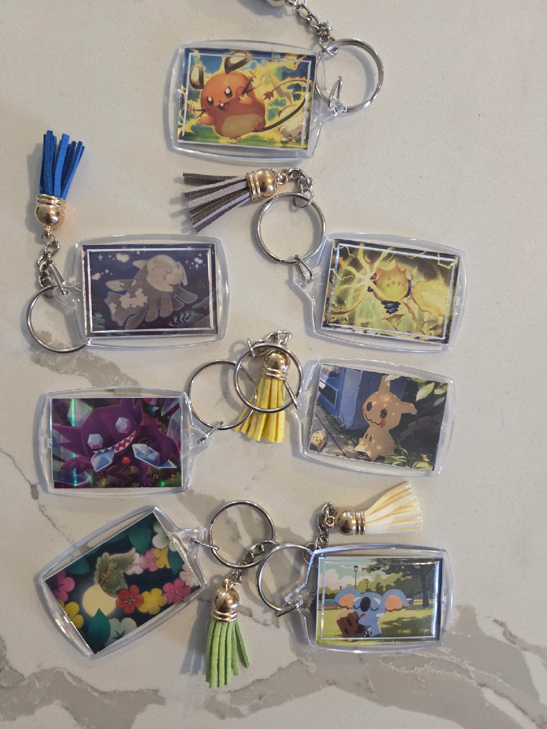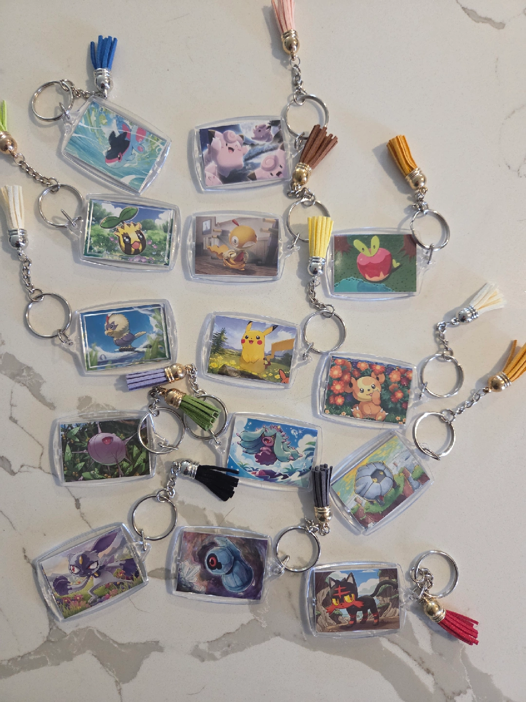 Lots of cute Pokemon character keychains for sale! Each keychain has a little tassel attached. Perfect for adding some flair to your keys or backpack. They also make great party favors 1 for $3 2 for $5 or 10 for $20