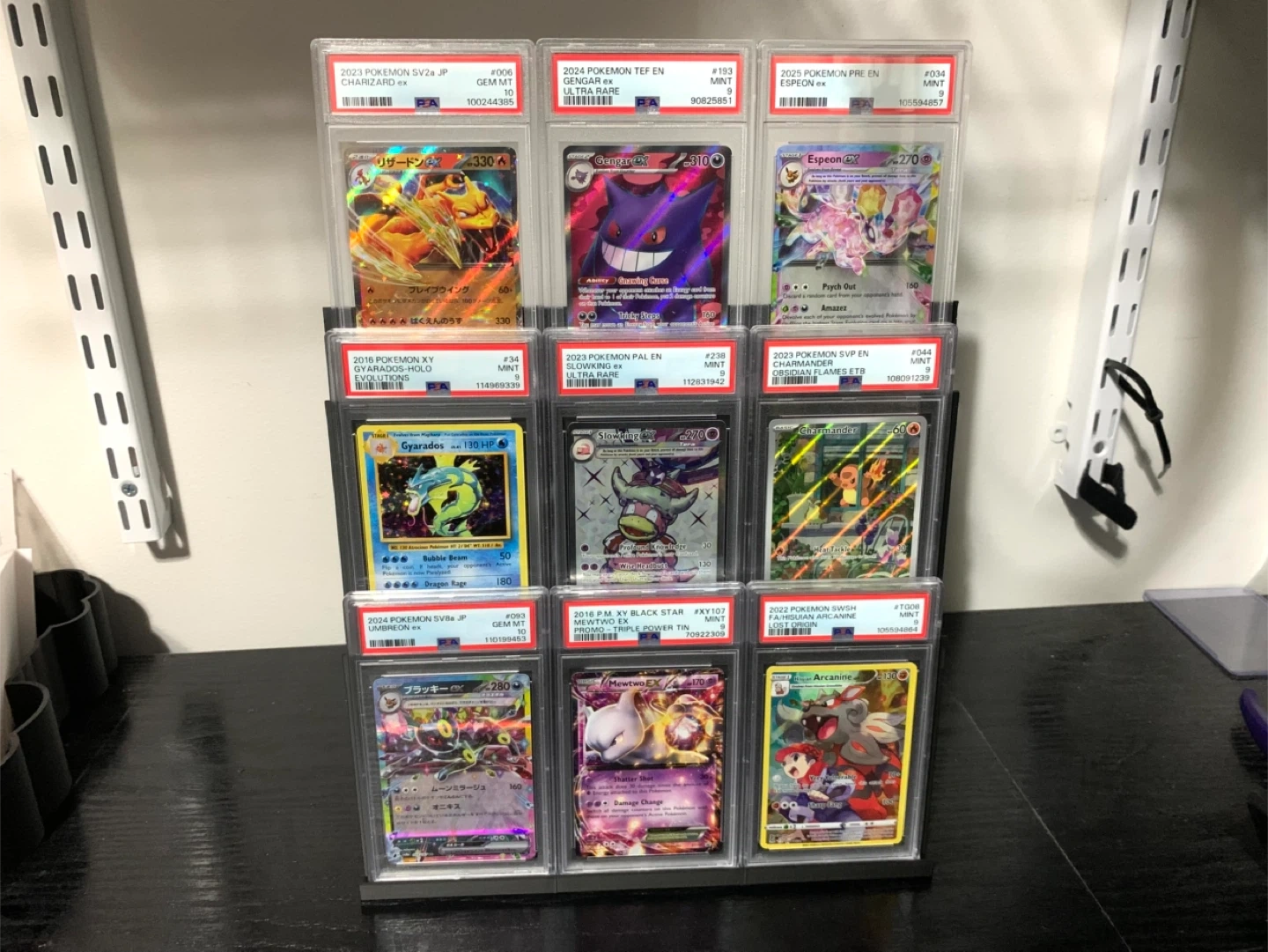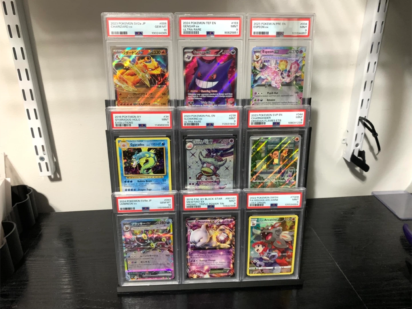 Selling a black display stand for Pokemon PSA graded cards. It's in great shape and perfect for showing off your collection! Cards not included only display!!