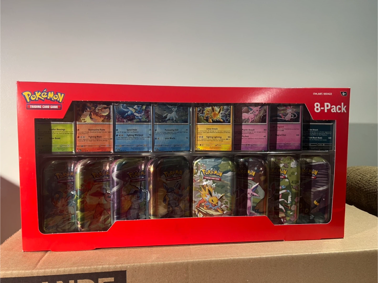 65Sealed Prismatic Evolutions Mini Tin 8-Pack. Inside the box are promo cards for all eveelutions, 8 tin with 2 booster packs of prismatic evolution per tin Price: $180 per box - open to negotiating if buying multiple. Current Quantity Available: 8 sealed boxes left. Pick Up: Public Meet Up in Newmarket