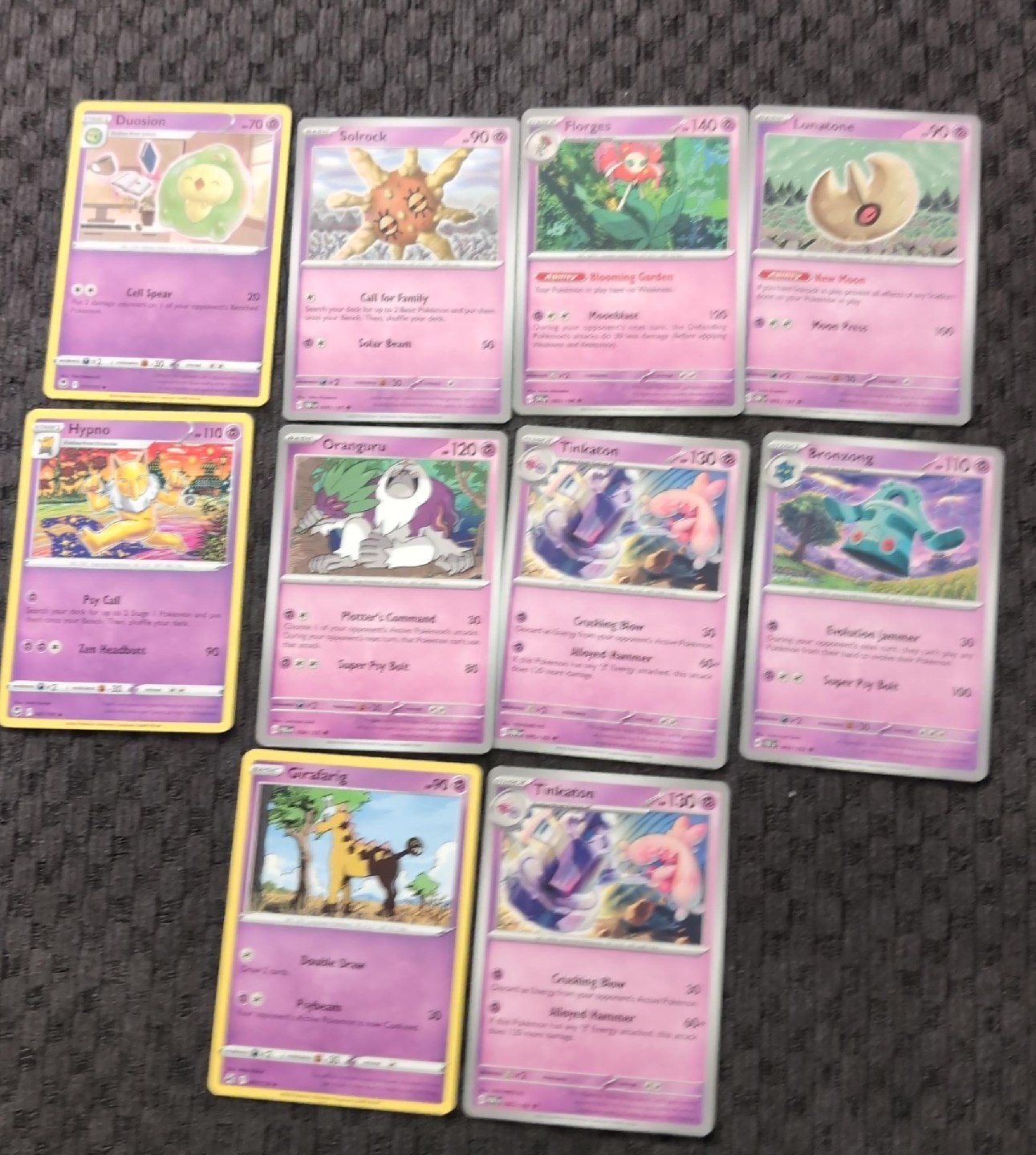 65Selling a collection of Pokemon trading cards! Includes Duosion, Solrock, Florges, Lunatone, Hypno, Oranguru, Tinkaton, Bronzong, and Girafarig. Great for collectors or players looking to expand their deck
