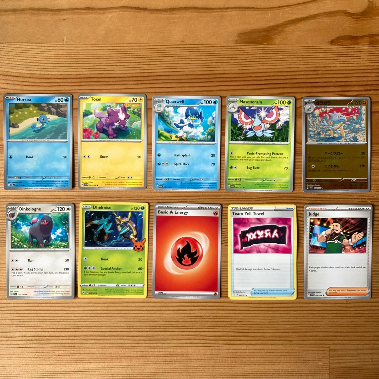 Selling a variety of Pokemon trading cards. Includes Horsea, Toxel, Quaxwell, Masquerain, Oinkologne, Dhelmise, and more! Perfect for collectors or players looking to expand their deck.